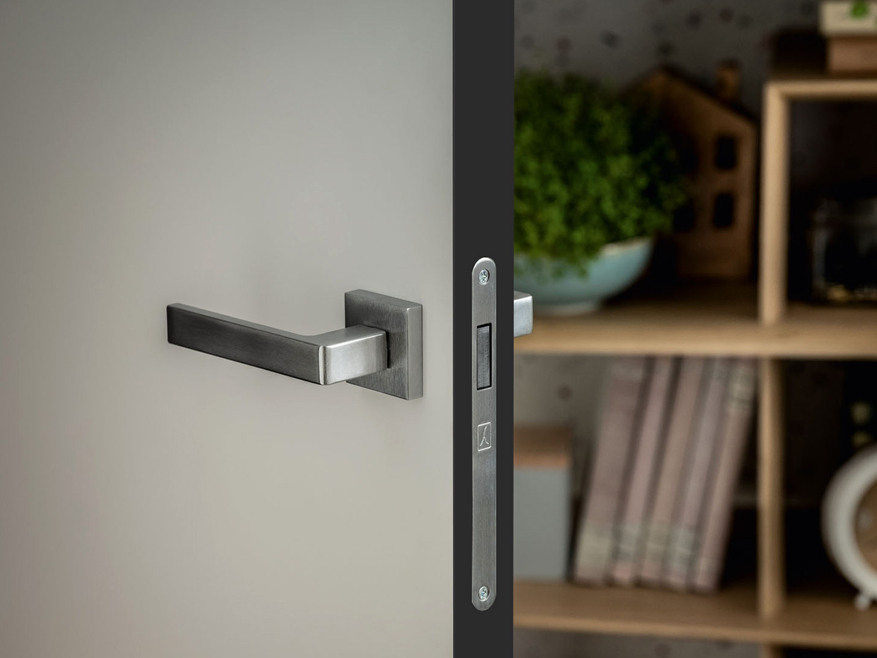 Drzwi Rimo+ wykończne są matową okleiną w kilku kolorach do wyboru: biały mat, jasnoszary mat, kaszmir mat, warm grey mat.