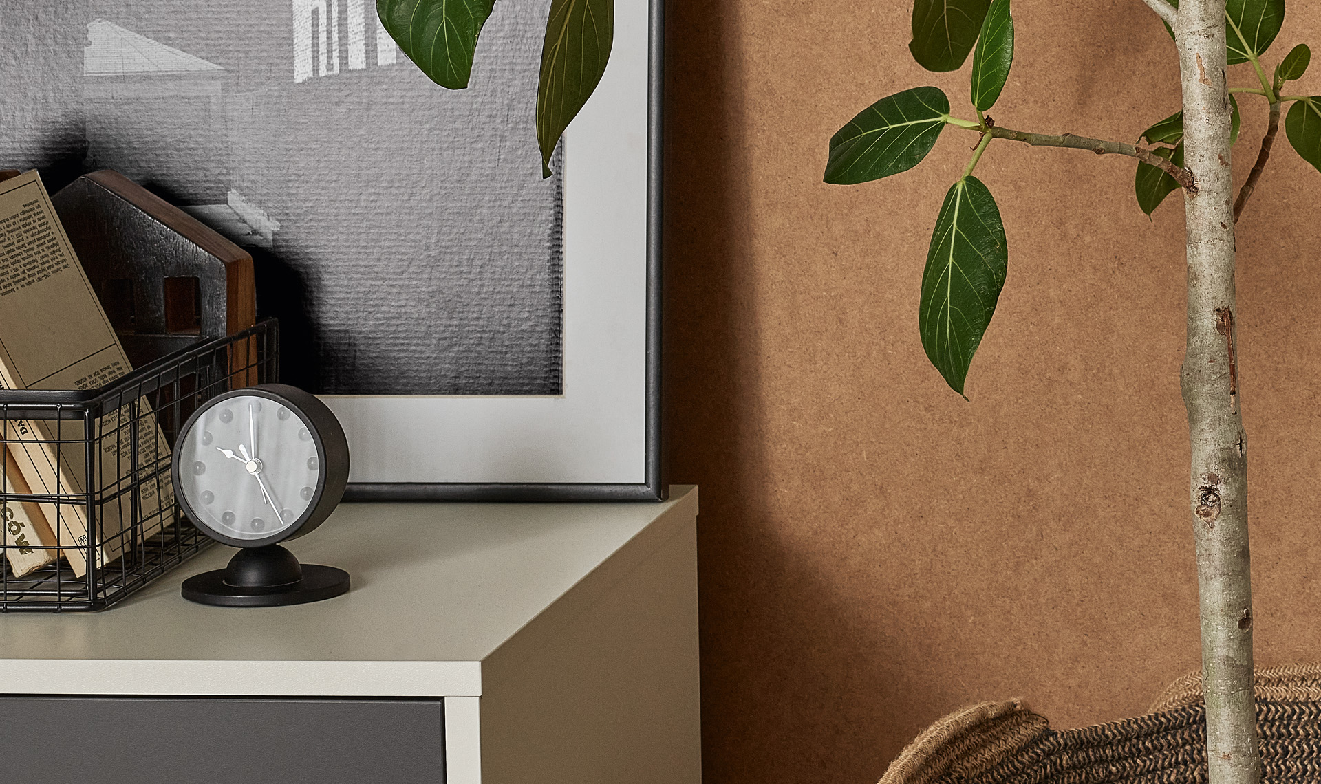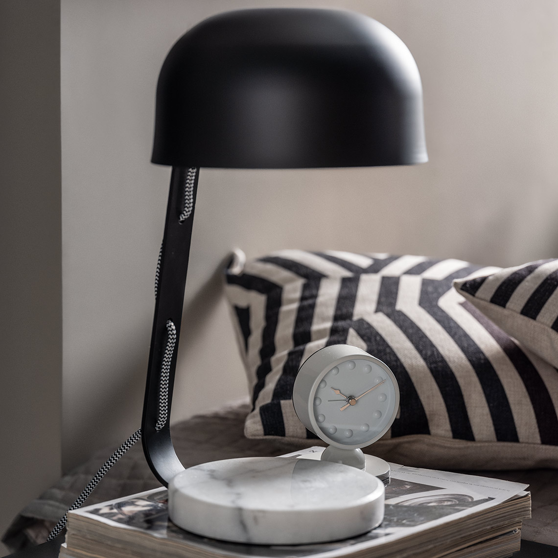 modern shape, hours conventionally marked with large dots, hands in contrasting color make it easy to read the time