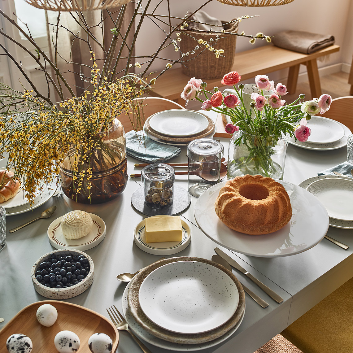 Pulve is a collection consisting of: a mug, plates in two sizes, a bowl and a pitcher.All elements of the collection are suitable for food contact.From the individual elements you can compose a breakfast set: a small plate, a bowl, a mug and a pitcher or - attaching a large plate, also a lunch and dinner set.The plates are packed in 2 pieces.The dishes are dishwasher safe.
