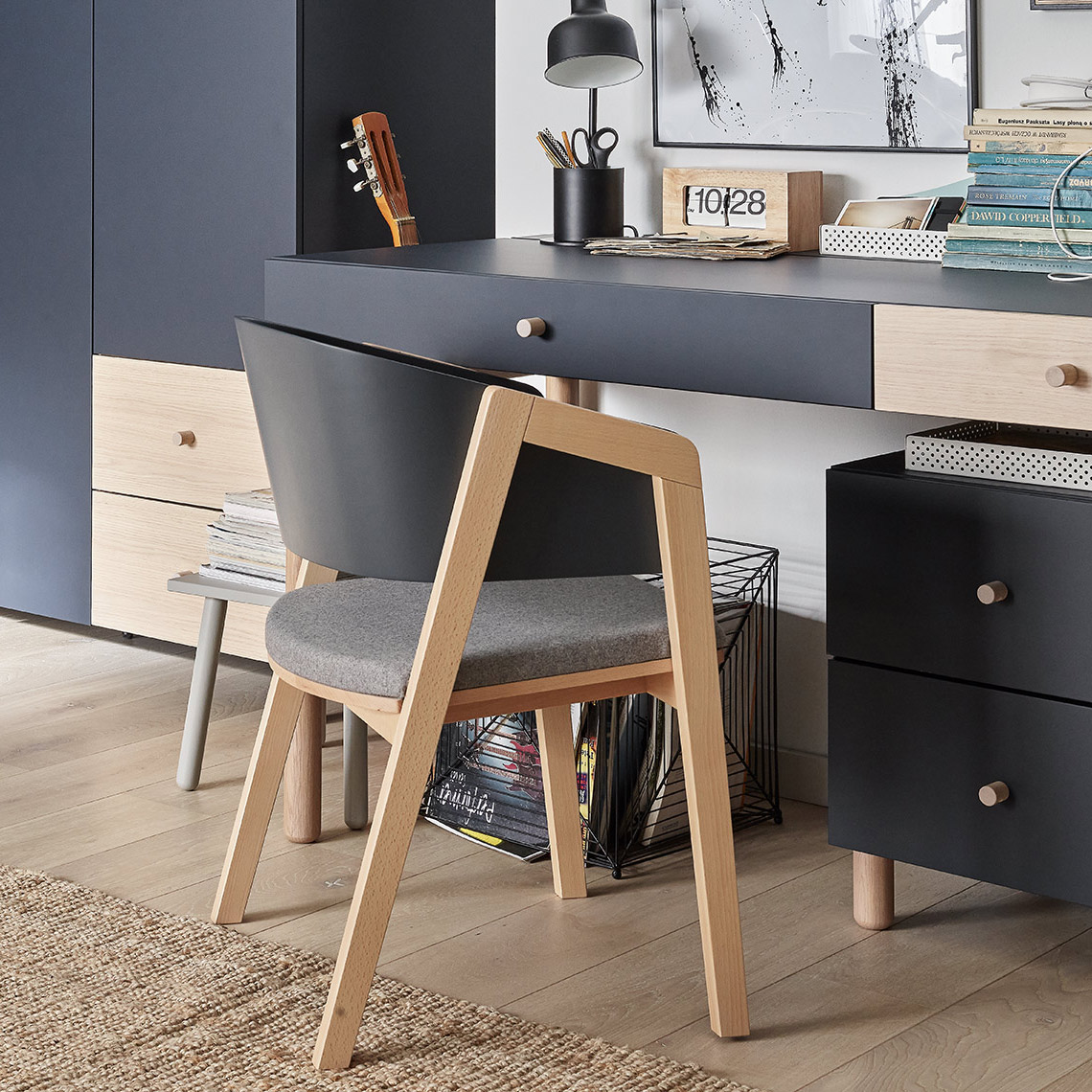 Durable beech wood was used for the chair's frame. The curved backrest was created from plywood, and the seat is finished with a fabric consisting of 40% wool, 32% viscose and 28% polyester.