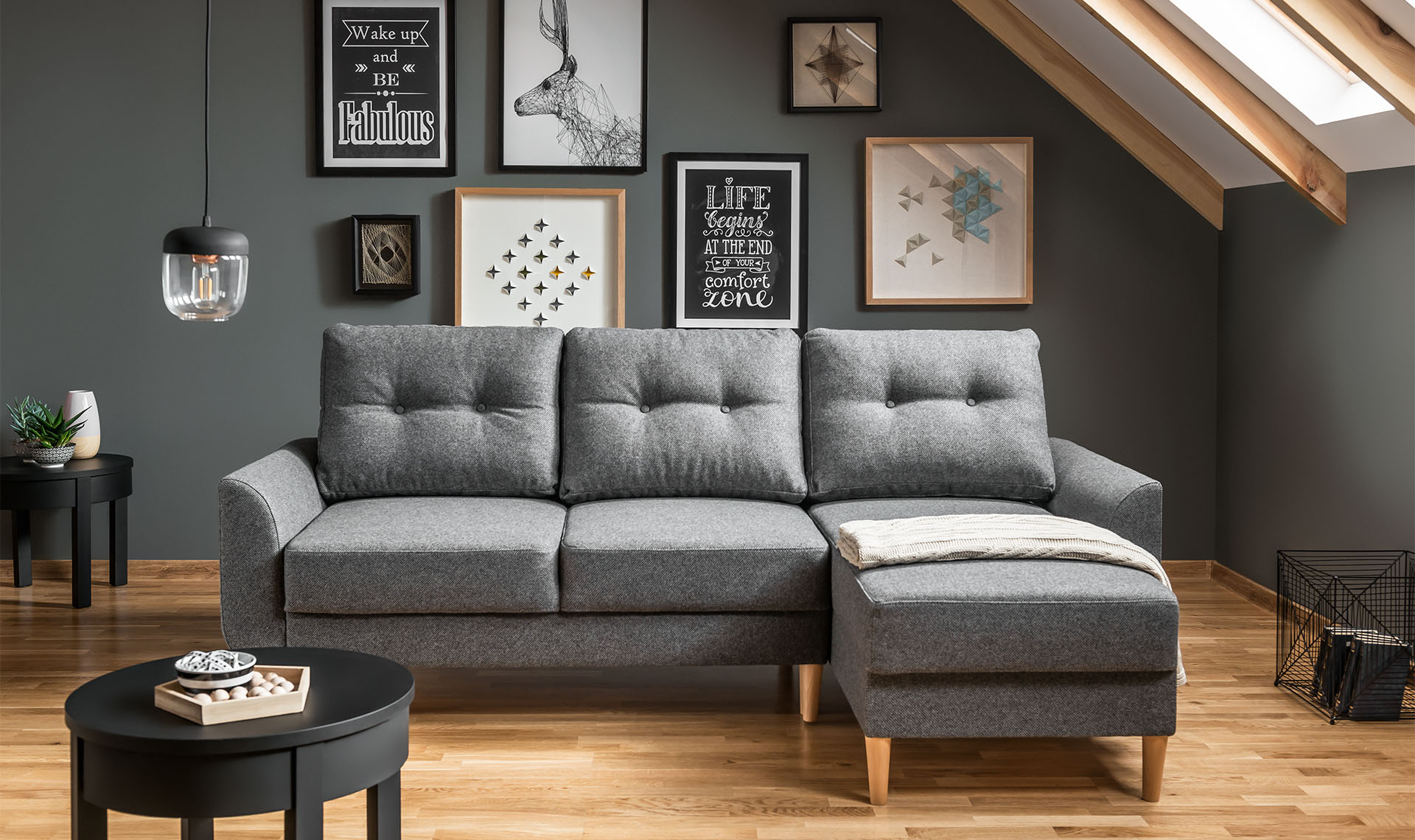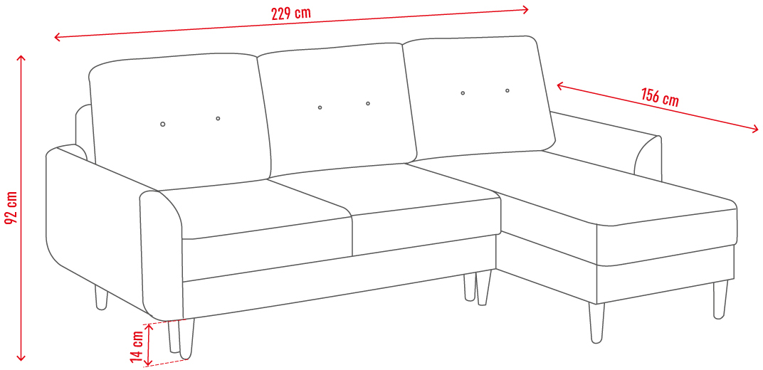- The 14 cm high legs of the corner sofa make it easy to clean the room. They can be in one of 6 shades: wenge, beech, light brown, dark brown, white or black.