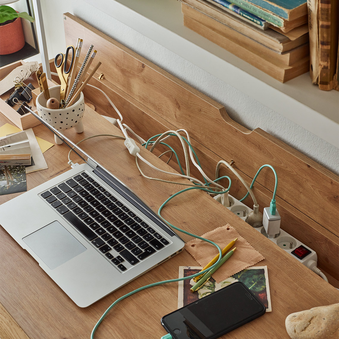 - In the back of the top there is a lockable recess with two pass-through holes. It is worth placing an electrical strip in it. This will easily organize any cables and chargers, protecting them from tangling and dust.