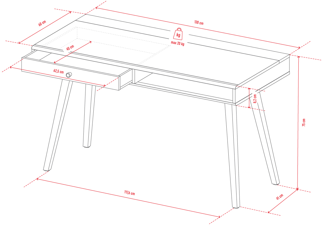 - The desk rests on solid oak wood legs, protected with matte lacquer. The maximum allowable load of the desk is 20 kg.