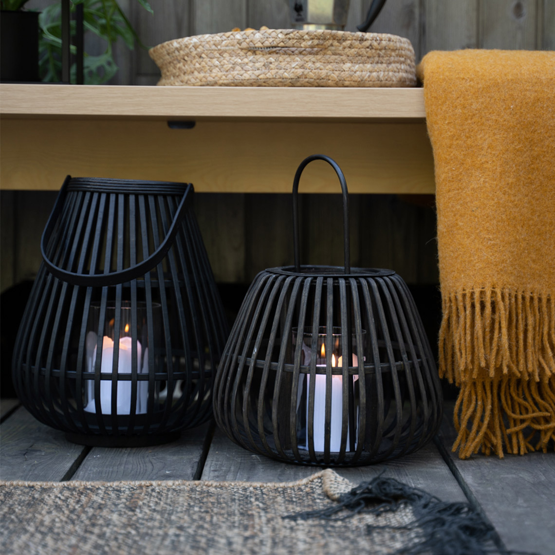Bamboo lantern with handle, for standing or hanging. The PIT lantern is available in two sizes. You will get the most interesting arrangement by putting lanterns of both sizes next to each other. Inside the lantern is a glass container for a candle (candle to be purchased on your own).