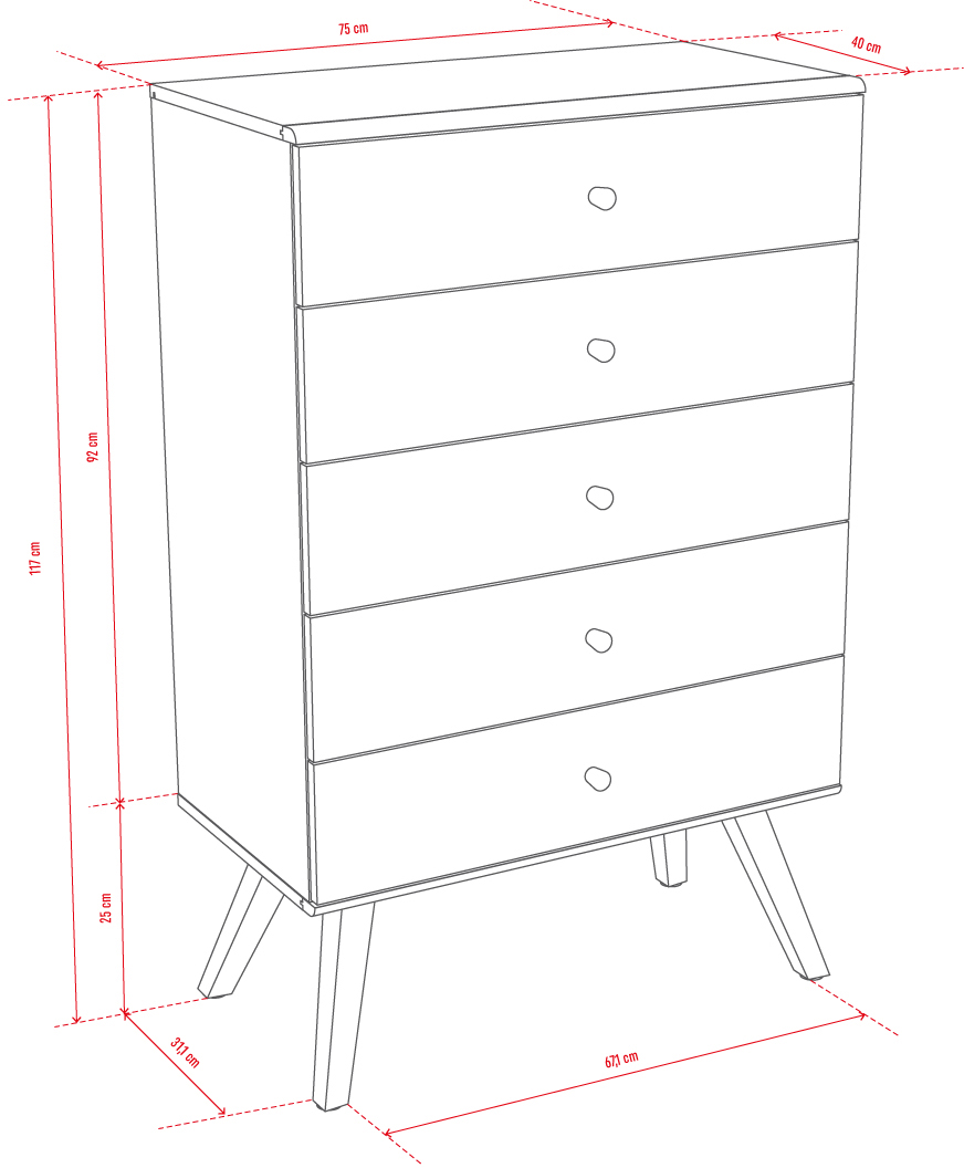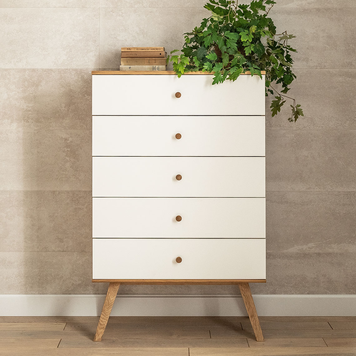 - The chest of drawers has five capacious drawers. All of them are equipped with a silent closing system, so no one will disturb your nap with loud slamming.