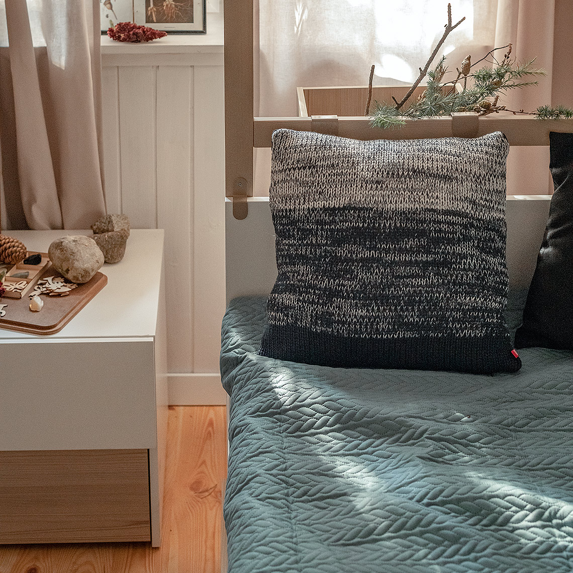 The pillow has a zippered pillowcase, which can be washed by hand in lukewarm water.Thanks to a special stitch, the pillow gives the impression of being knitted.With its unique design, it will bring a homely atmosphere to the interior.Erin pillow comes in two color variants: navy blue and gray.