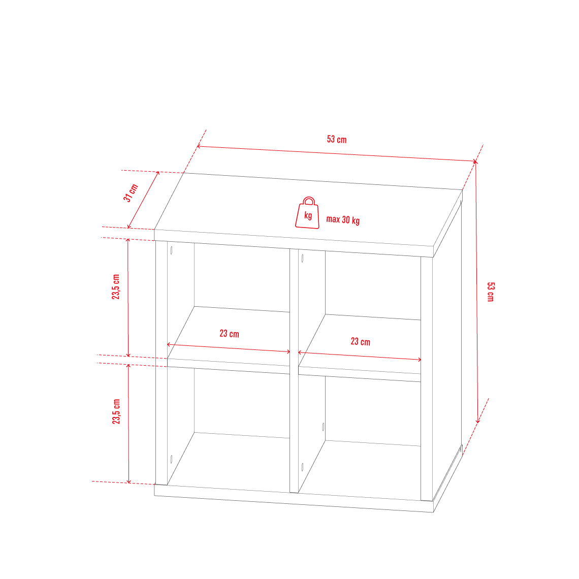 - The interior of the cube shelf hides 4 functional spaces for various types of items. Here you can organize books, records, games, tableware or things related to your hobbies.
