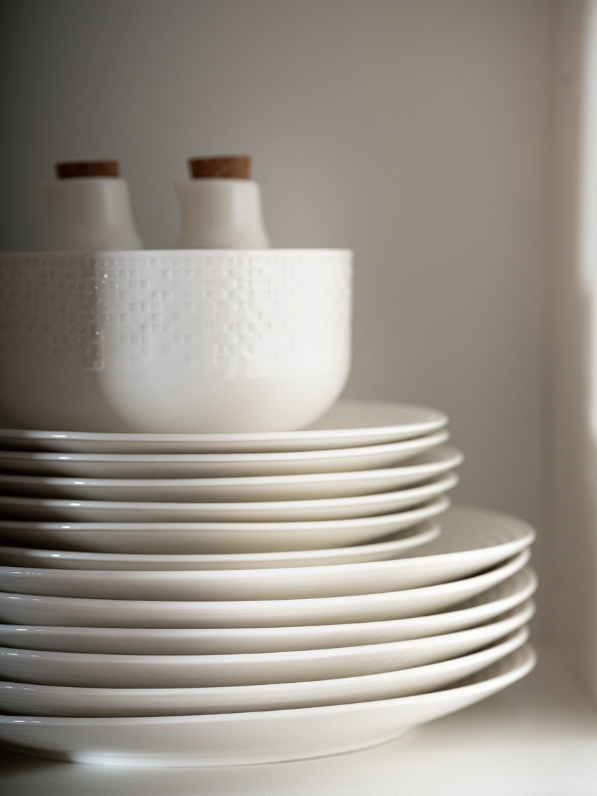 Three-dimensional decoration on the elements of Motif collection is an interesting aesthetic treatment, which allows both to give the objects a unique character and to maintain their neutrality. The collection includes: small plate (set of 2pcs.), medium plate (set of 2pcs.), large plate (set of 2pcs.), deep plate (set of 2pcs.), small bowl, large bowl, 0,85l pitcher, sugar bowl, creamer, cup with saucer (set of 2pcs.), mug, salt and pepper shaker.