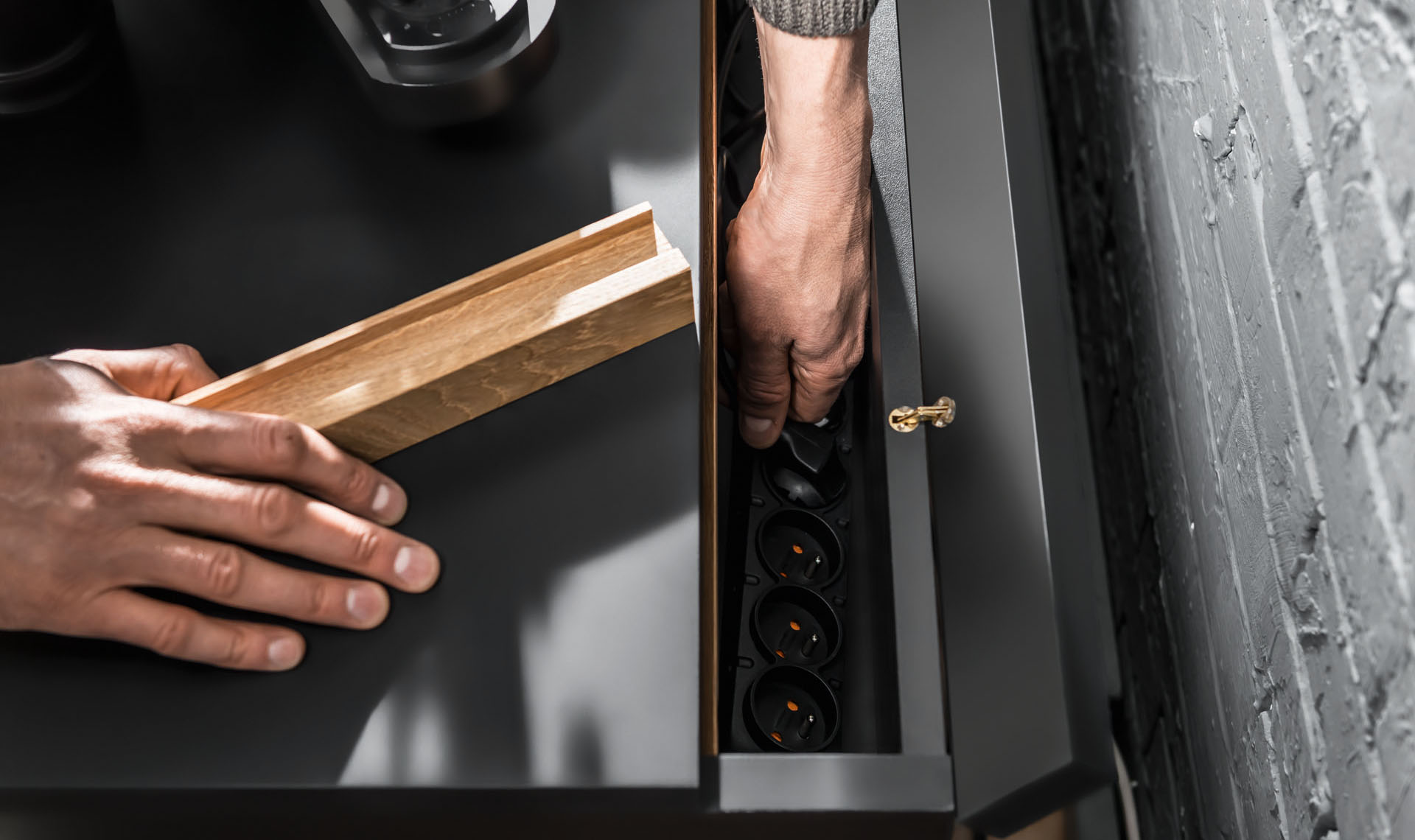 - Just next to the gutter there is a special slot on which you can hang a ready set of plugs. They allow you to create gaps of the size you need to bring the cables out to the cabinet and connect the equipment that is on the furniture. For a ready-made set of plugs you can also buy an additional one (the smallest one), so as to fully close the gap.