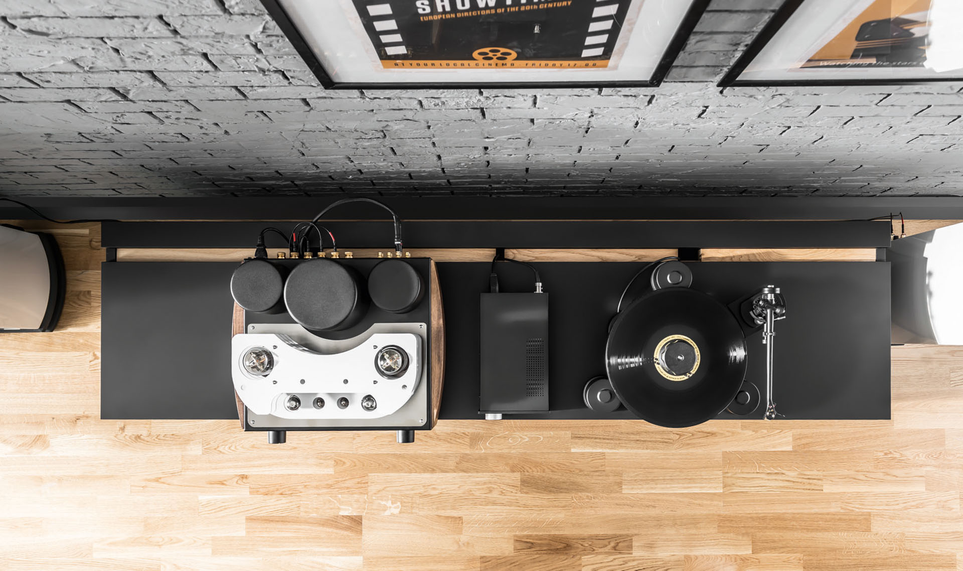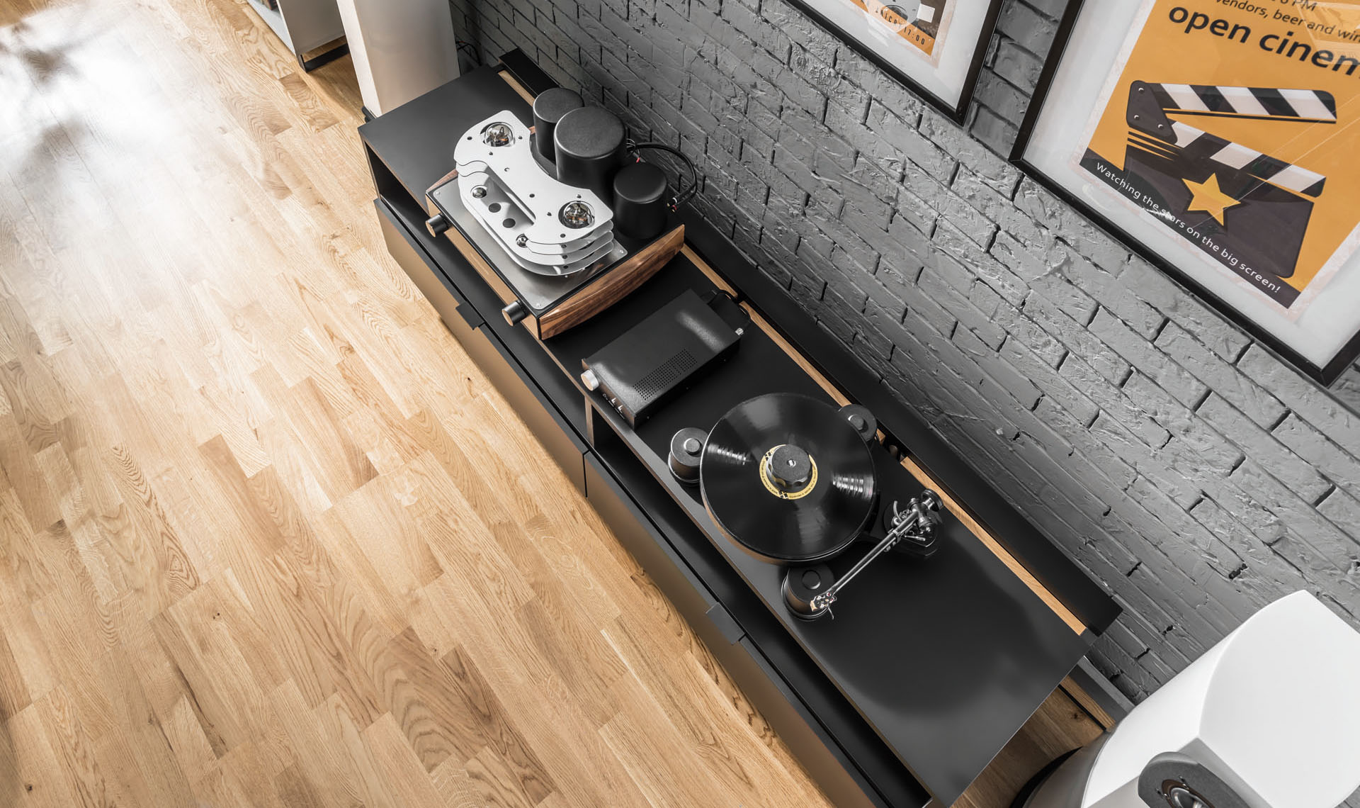 - The open spaces will accommodate almost any electronic equipment (including the thick cables that come out of it). The depth of the furniture is a combination of several guidelines: a piece of furniture not too deep for a hanging TV, not too shallow for one standing on a cabinet.