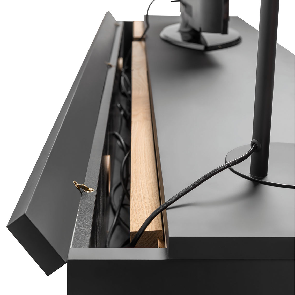 - In the back of the furniture there is a gutter closed with a flap. This is the place to put the electrical strip and all the cables that need to be connected to it. This will not only tame the cable mess, but also protect the cables from collecting dust. The gutter closes with a flap on special, discreet hinges that enhance the aesthetics of the furniture. Two beech cable grommets allow you to bring electricity, internet and antenna signals into the cabinet. Instead of a dense stream of cables, a maximum of 3 will protrude from the furniture!
