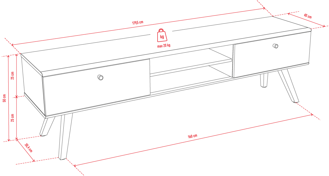 - The cabinet is formed by two deep drawers on the sides and an open space with a permanently installed shelf. Thanks to a grommet in the center of the furniture, it is easy to lead out cables from the TV and other equipment.