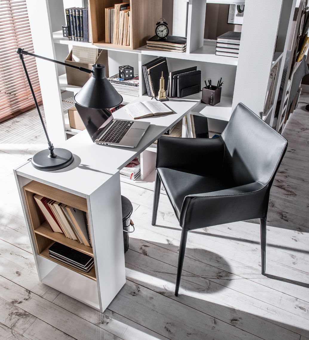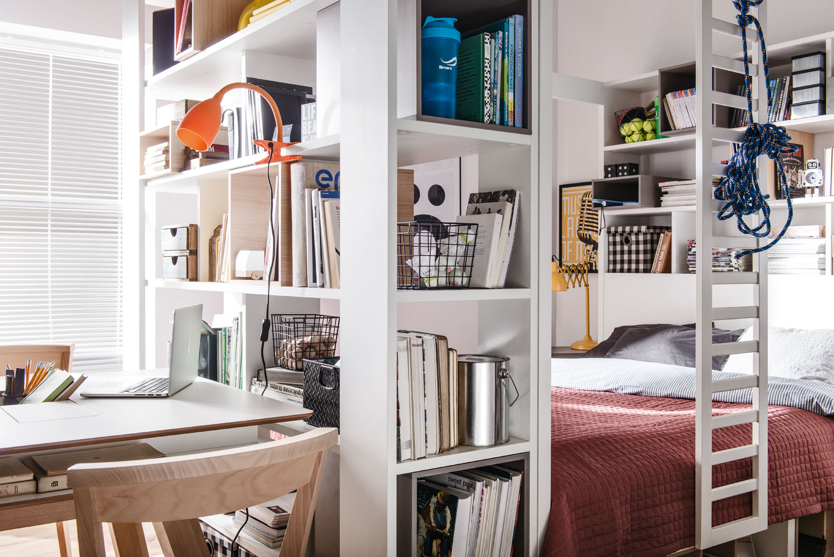 - Need a place to work? Just add a dedicated dressing table to the bookcase. Leaning it against one of the shelves, you will create a comfortable desk with quick access to books and documents.