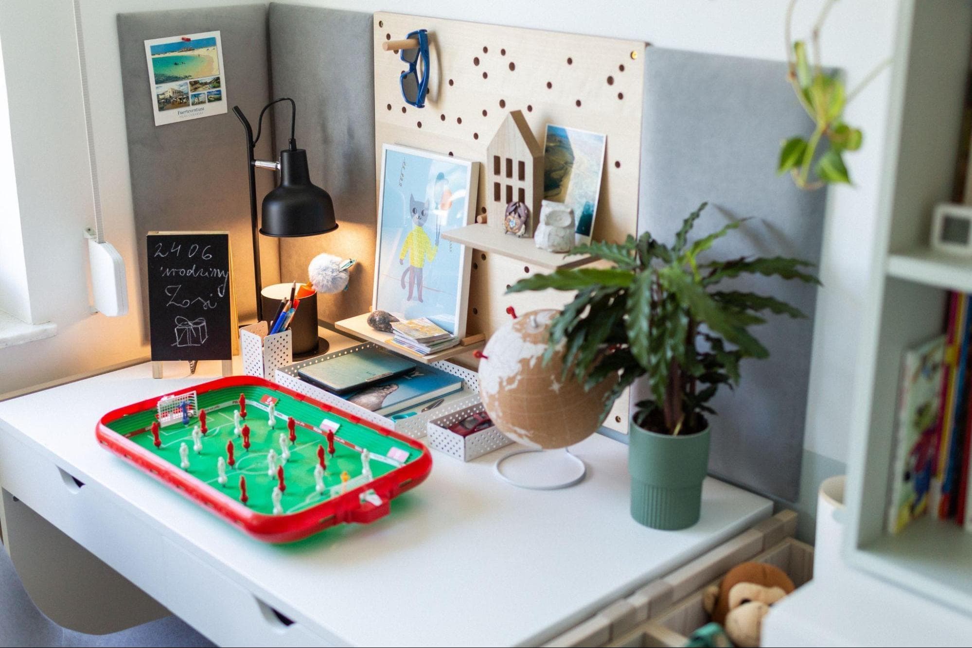 Po drugiej stronie znalazło się duże biurko z wbudowanym organizerem i pojemną skrzynką z przegrodami, w której Ada może przechować ostatnio wykonane prace. Jeśli będzie potrzebować więcej miejsca na blacie, wystarczy, że odwróci przybornik do góry nogami i w ten sposób zwiększy przestrzeń roboczą. Nad biurkiem zamontowaliśmy tablicę Slot z drewnianymi półkami i kołkami. Akcesoria pozwolą dziewczynce wyeksponować różne drobiazgi i dekoracje na ścianie.