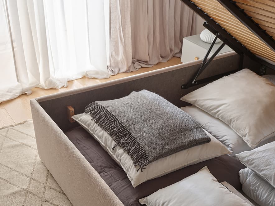 Wyściełana tkaniną skrzynia pomieści pościel, sezonową odzież i zabawki. Nie posiada wewnętrznych przegród, dzięki czemu możesz przechowywać tu przedmioty o różnej wielkości. Codzienne korzystanie ze schowka ułatwi uchylny stelaż.