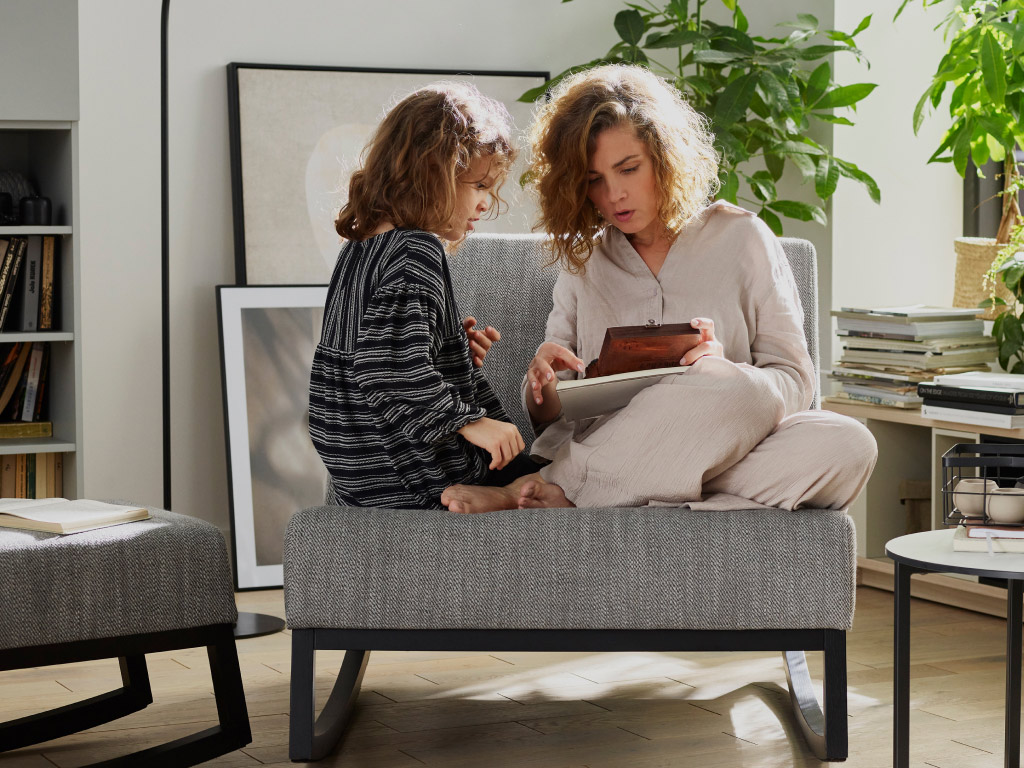 Fotel i podnóżek tworzą razem wyjątkowo gościnny zestaw wypoczynkowy. Doskonały na chwilę relaksu z dzieckiem przy ulubionej książce, a nawet we troje – z Waszym ukochanym pupilem.