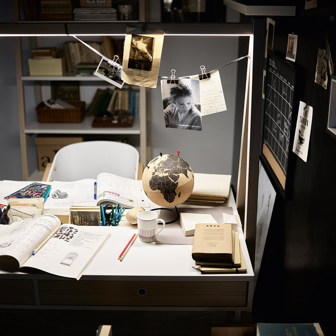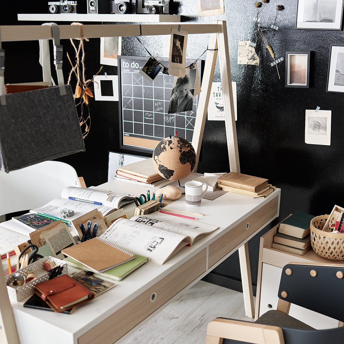 - Pod blatem roboczym znajdują się 4 wnęki. Można je wykorzystać jako otwarte półki na zeszyty i przybory lub wyposażyć w szuflady z tej samej kolekcji, aby przechowywać mniejsze przedmioty.