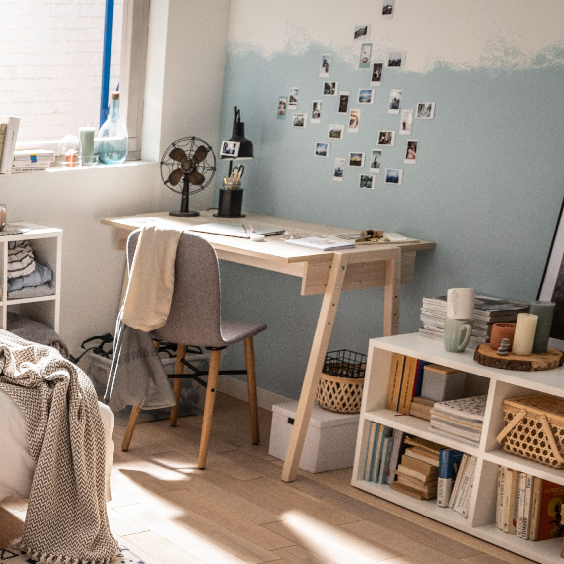 Biurko z kolekcji Spot Young z blatem o regulowanej wysokości i solidnymi nogami z drewna. Dzięki uniwersalnej kolorystyce sprawdzi się zarówno w pokoju dziecka, jak i nastolatka.
