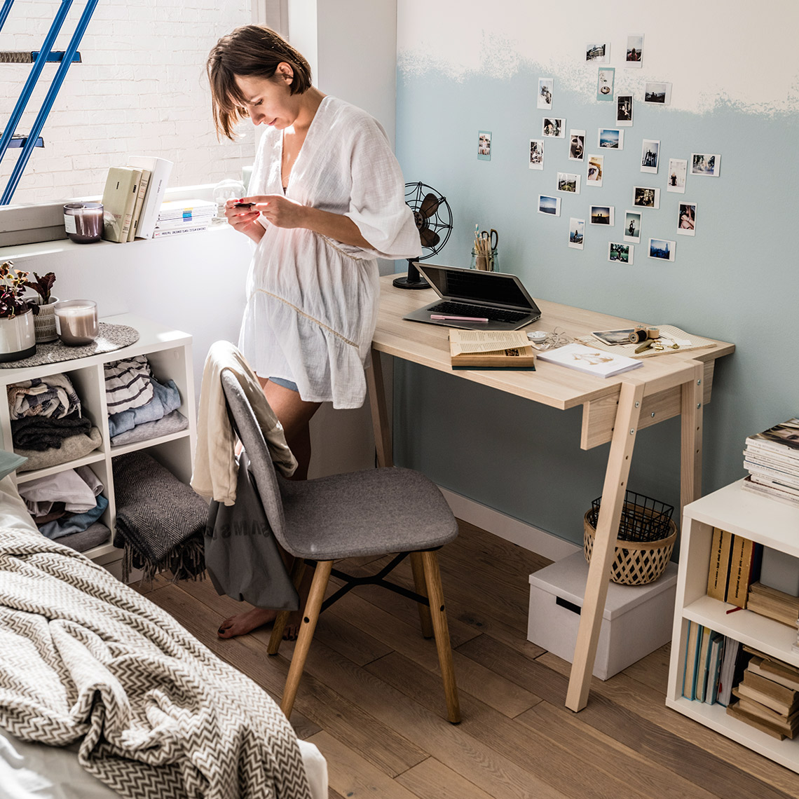 - Biurko Spot Young ma wybarwienie jasnego drewna akacjowego. Pasują do niego rozmaite dodatki.