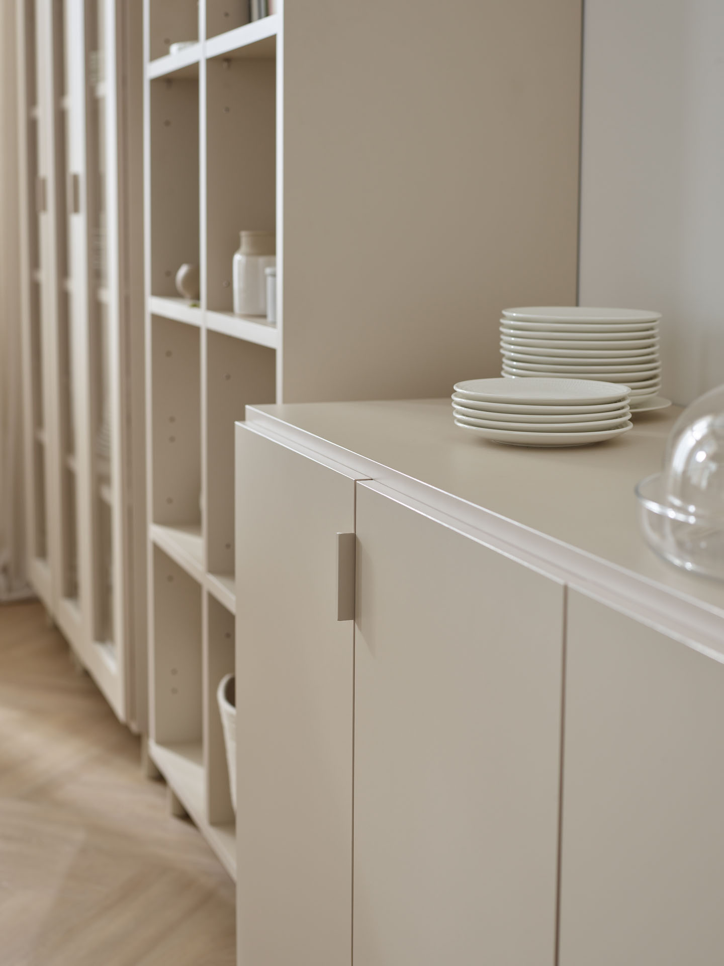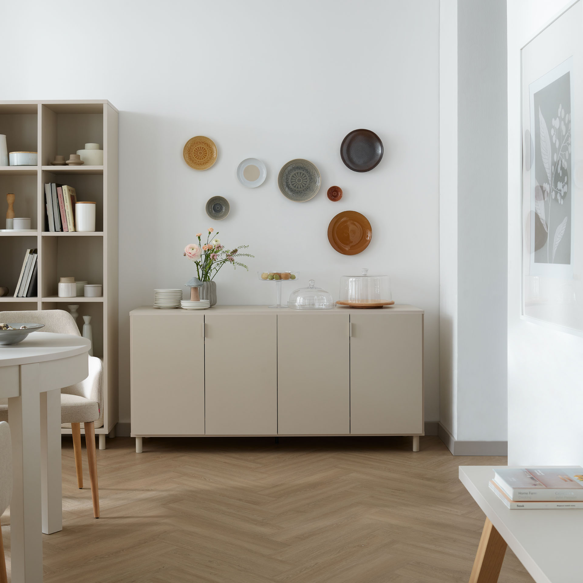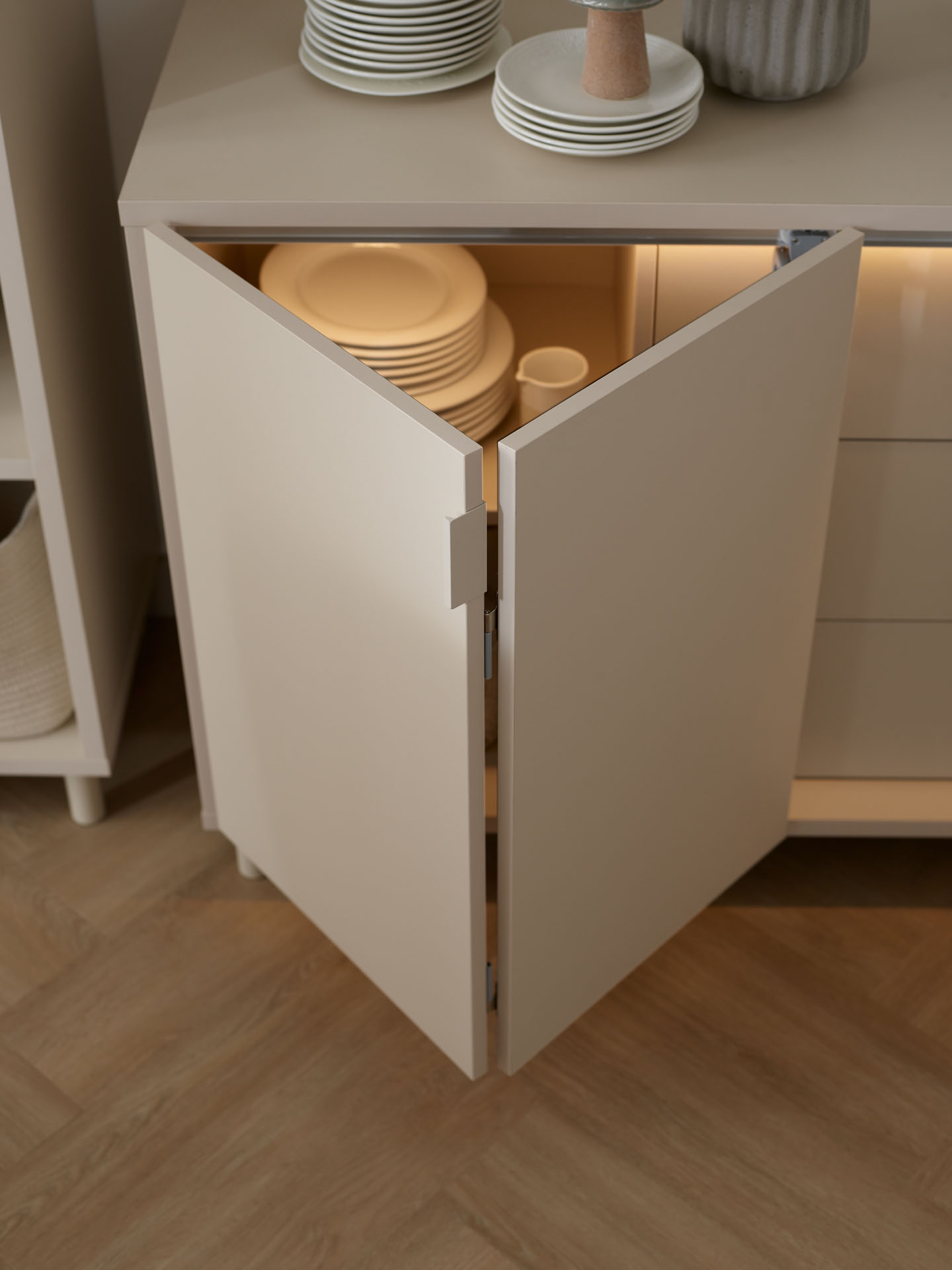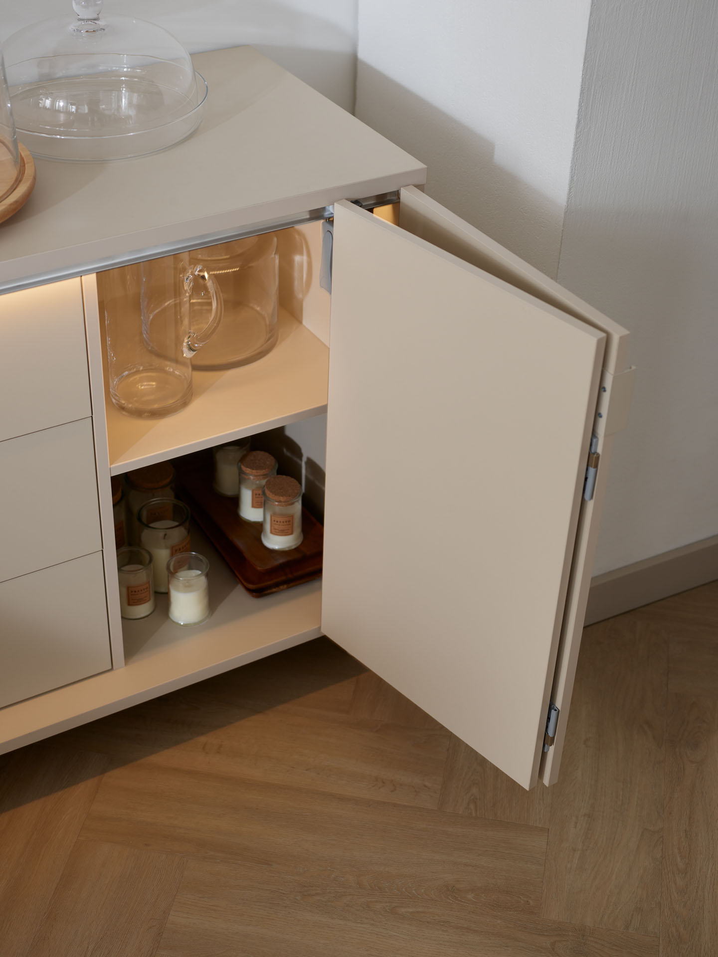 - Bufet posiada drzwi harmonijkowe z mechanizmem cichego domyku. Sposób ich otwierania jest wygodny nawet w ciasnych przestrzeniach, a ich konstrukcja zapewnia swobodny dostęp do całego wnętrza szafki.