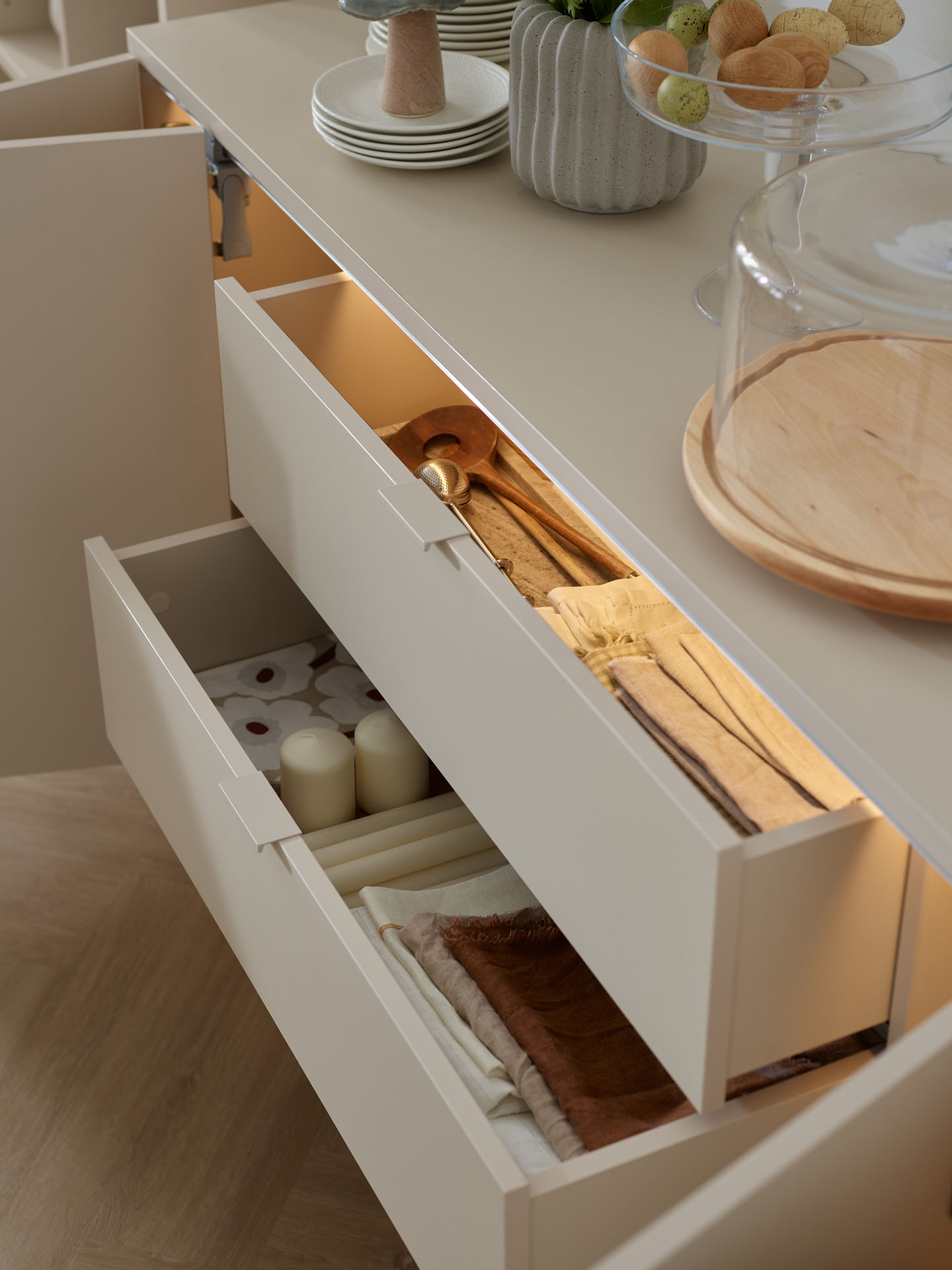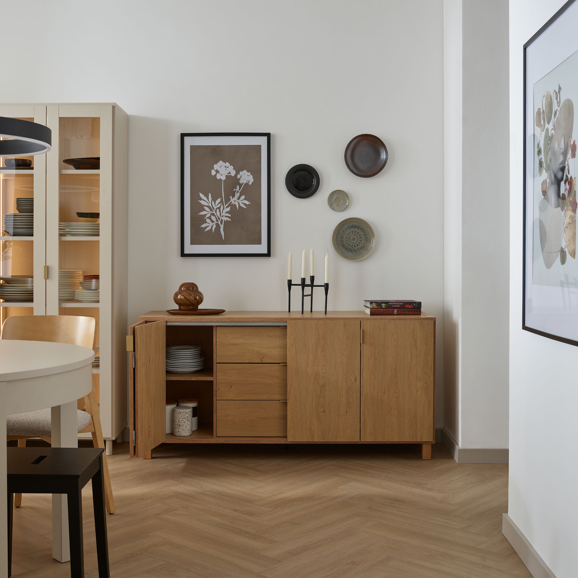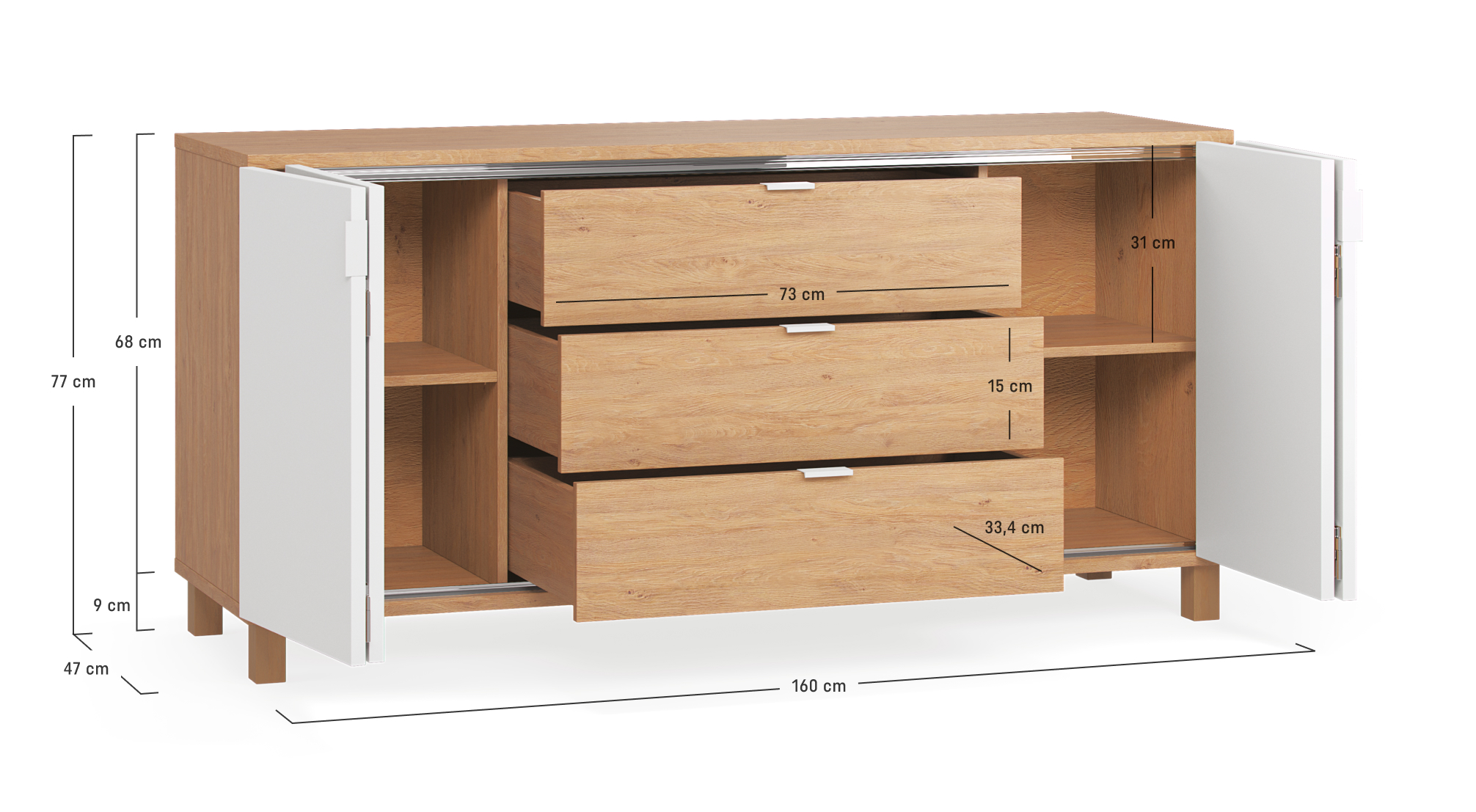 - W centralnej części bufetu umieszczono 3 cicho domykające się szuflady. Ich dna zostały dodatkowo wzmocnione, dzięki czemu nadają się do przechowywania cięższych przedmiotów.
