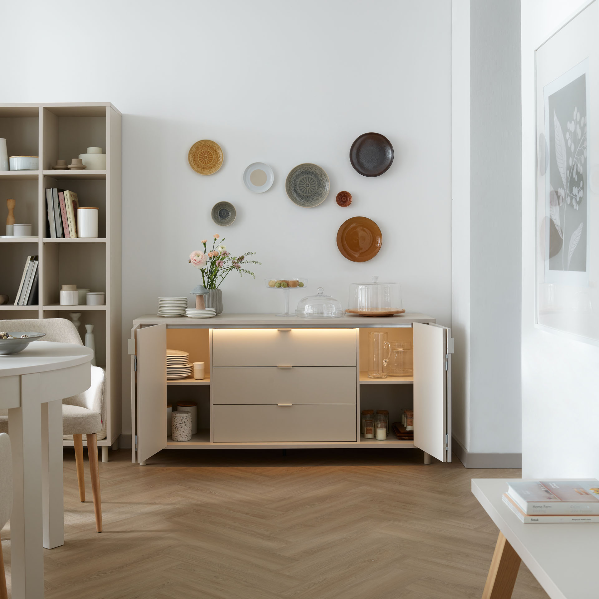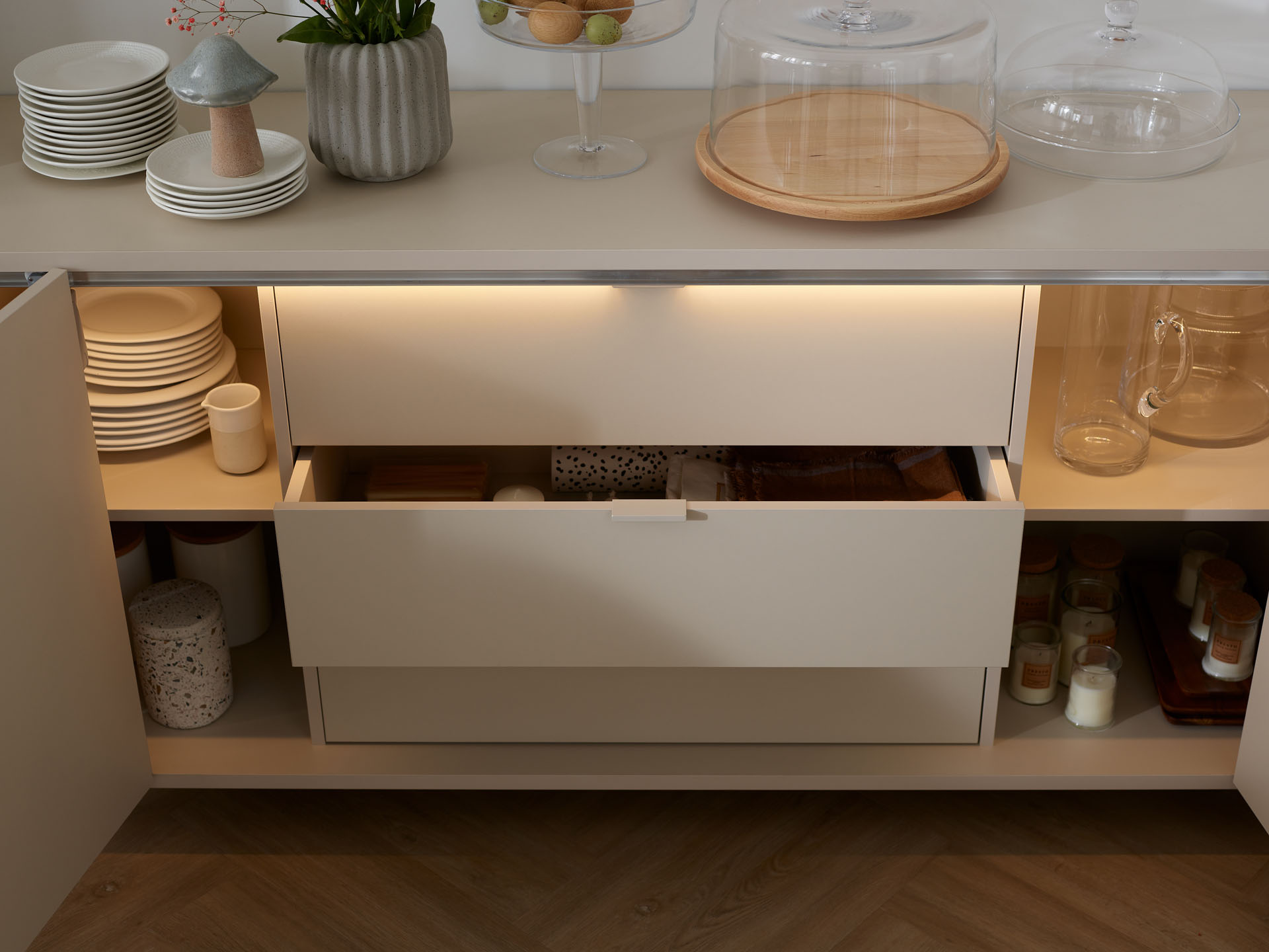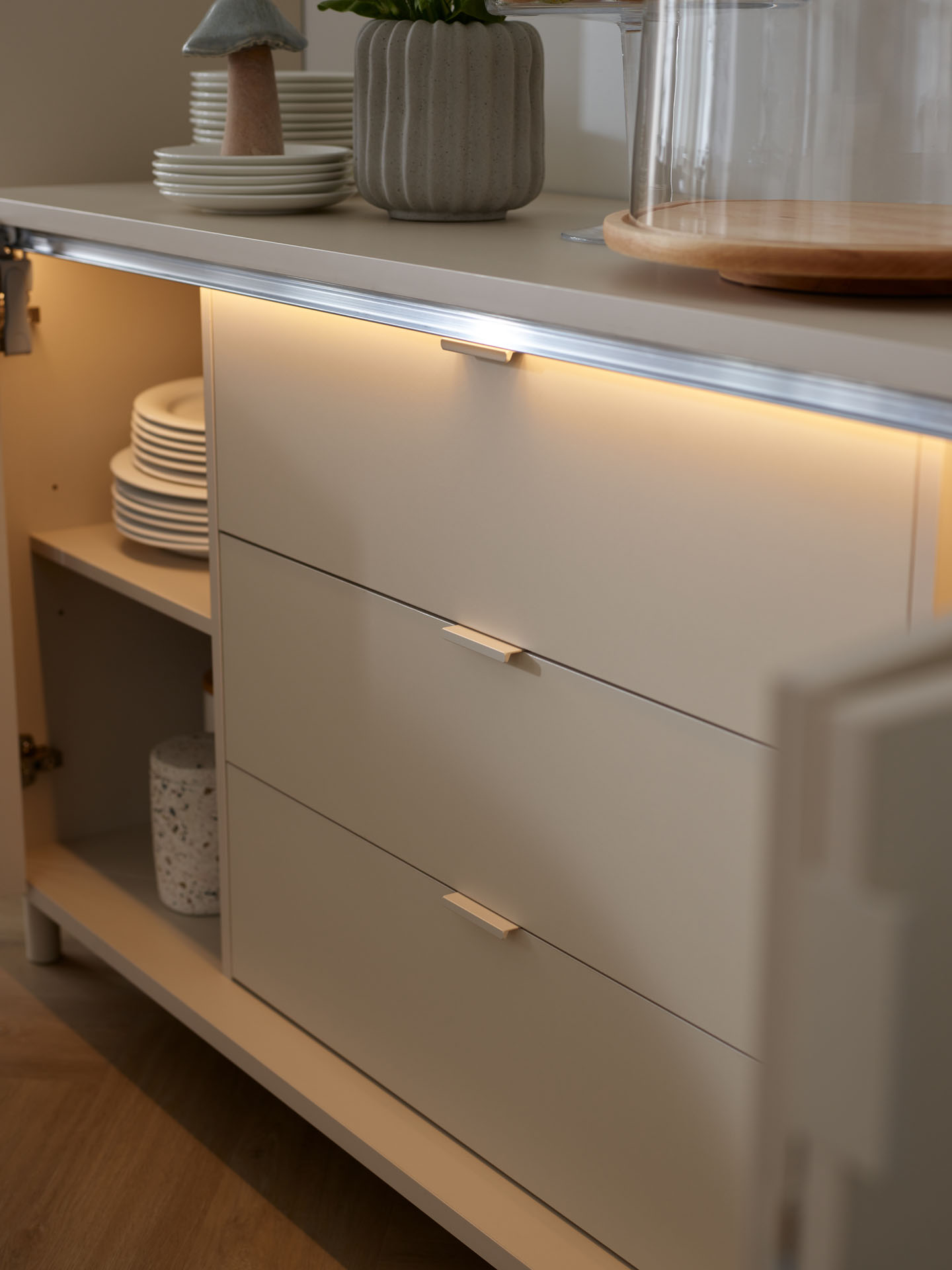 - W centralnej części bufetu umieszczono 3 cicho domykające się szuflady. Ich dna zostały dodatkowo wzmocnione, dzięki czemu nadają się do przechowywania cięższych przedmiotów.