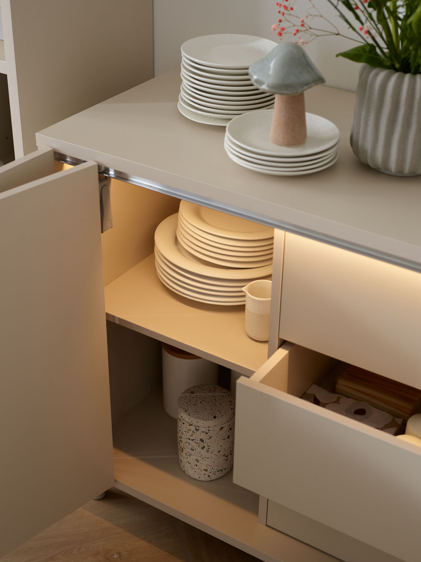 - Wewnątrz mebla znajdują się 2 otwarte przestrzenie – każda została wyposażona w półkę, której wysokość można regulować.