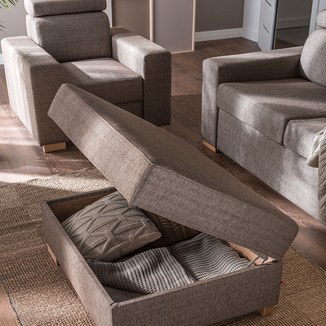 - Mebel tworzy komfortowy zestaw w połączeniu z pufem Milton, który pozwala odpocząć nogom w pozycji półleżącej. Do wyboru są 3 rozmiary podnóżka.