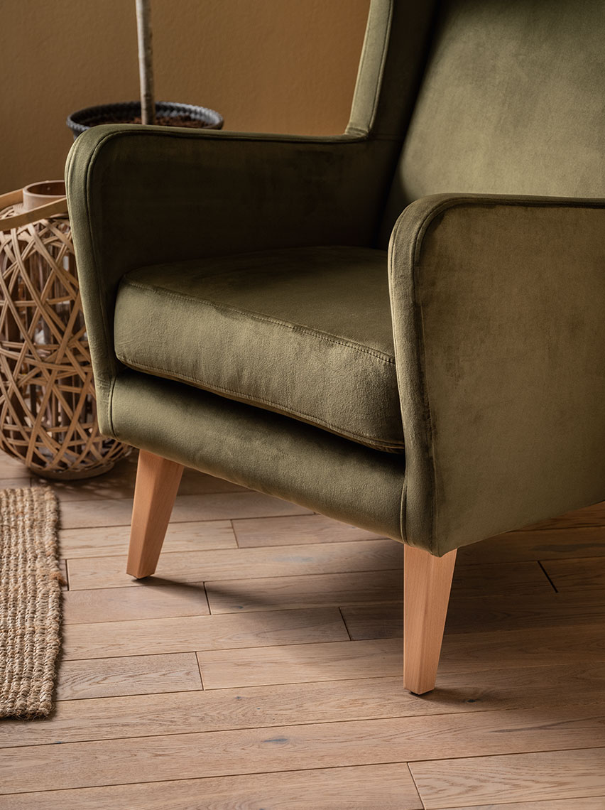 - Klasyczny fotel jest ustawiony na 4 wysokich nóżkach, które dodają mu lekkości i ułatwiają odkurzanie. Wykończenie nóżek możesz wybrać spośród następujących kolorów: wenge, ciemny brąz, jasny brąz, buk, czarny lub biały.