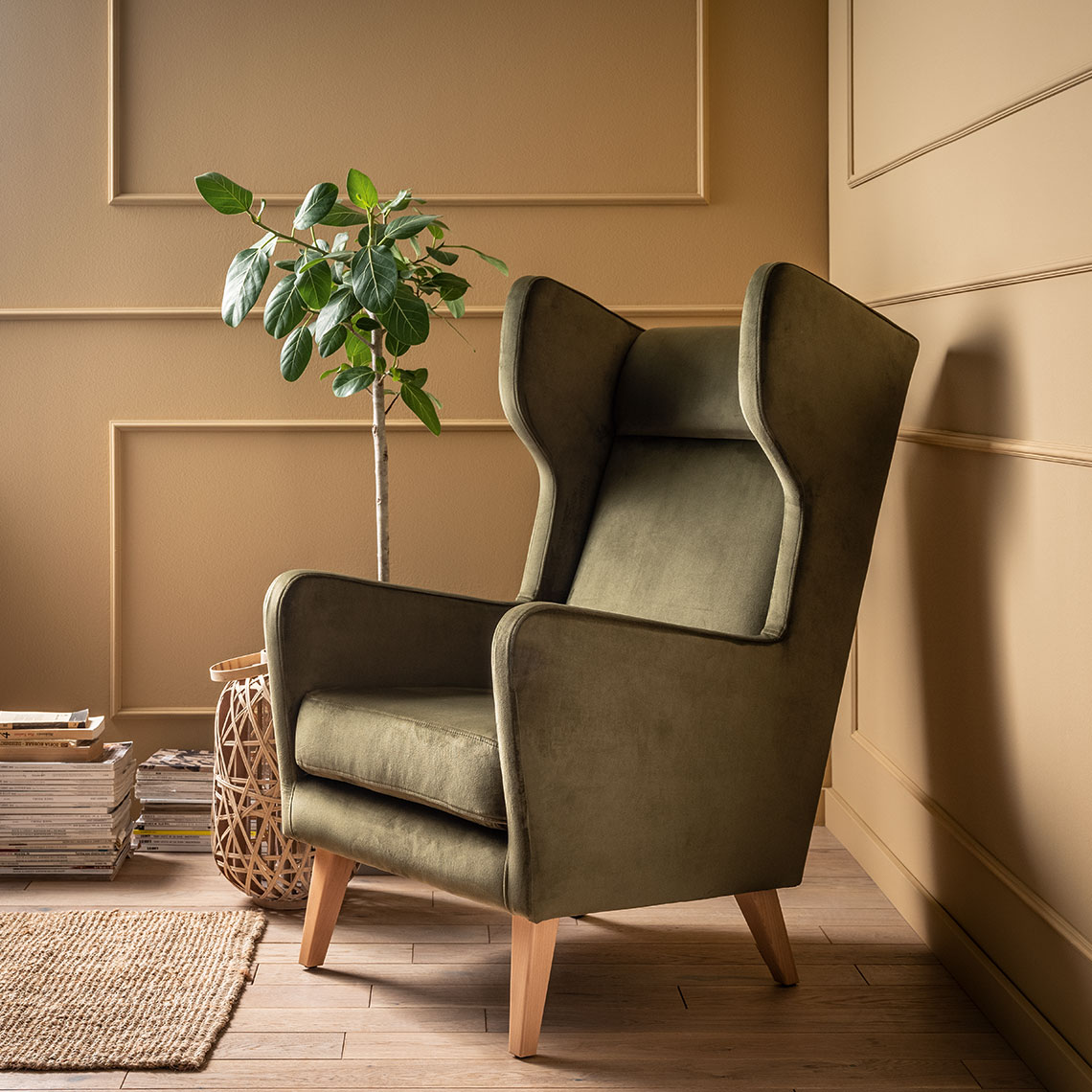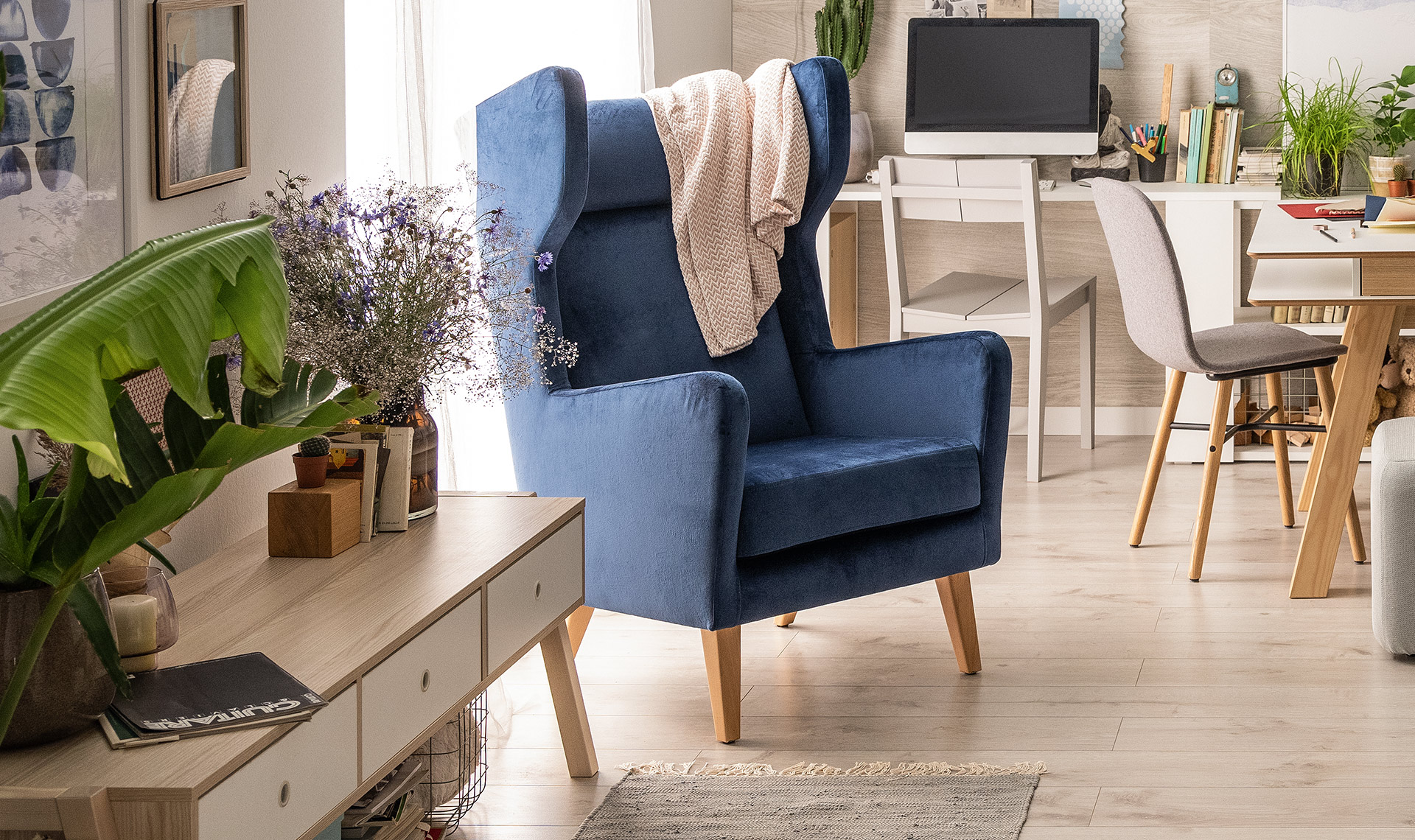 - Komfort wypoczynku na miękkim siedzisku podnoszą starannie zaprojektowane podłokietniki. Wysokie oparcie ma charakterystyczne “uszy”, o które można oprzeć głowę podczas krótkiej drzemki.