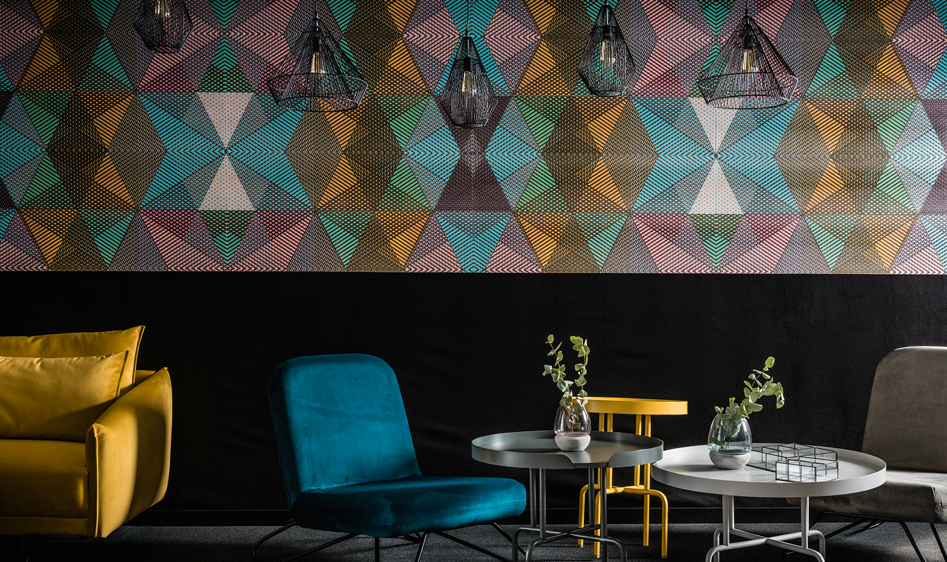 - Zestaw kolorów zastosowanych na panelach Geometric Cafe łączy się w piękną, kalejdoskopową kompozycję. Składają się na nią: intensywny turkus, miętowa zieleń, słoneczny pomarańcz i stonowany róż. Aby uzyskać spójną aranżację, wystarczy podkreślić jedną z tych barw za pomocą mebla lub dodatku o zbliżonym odcieniu.