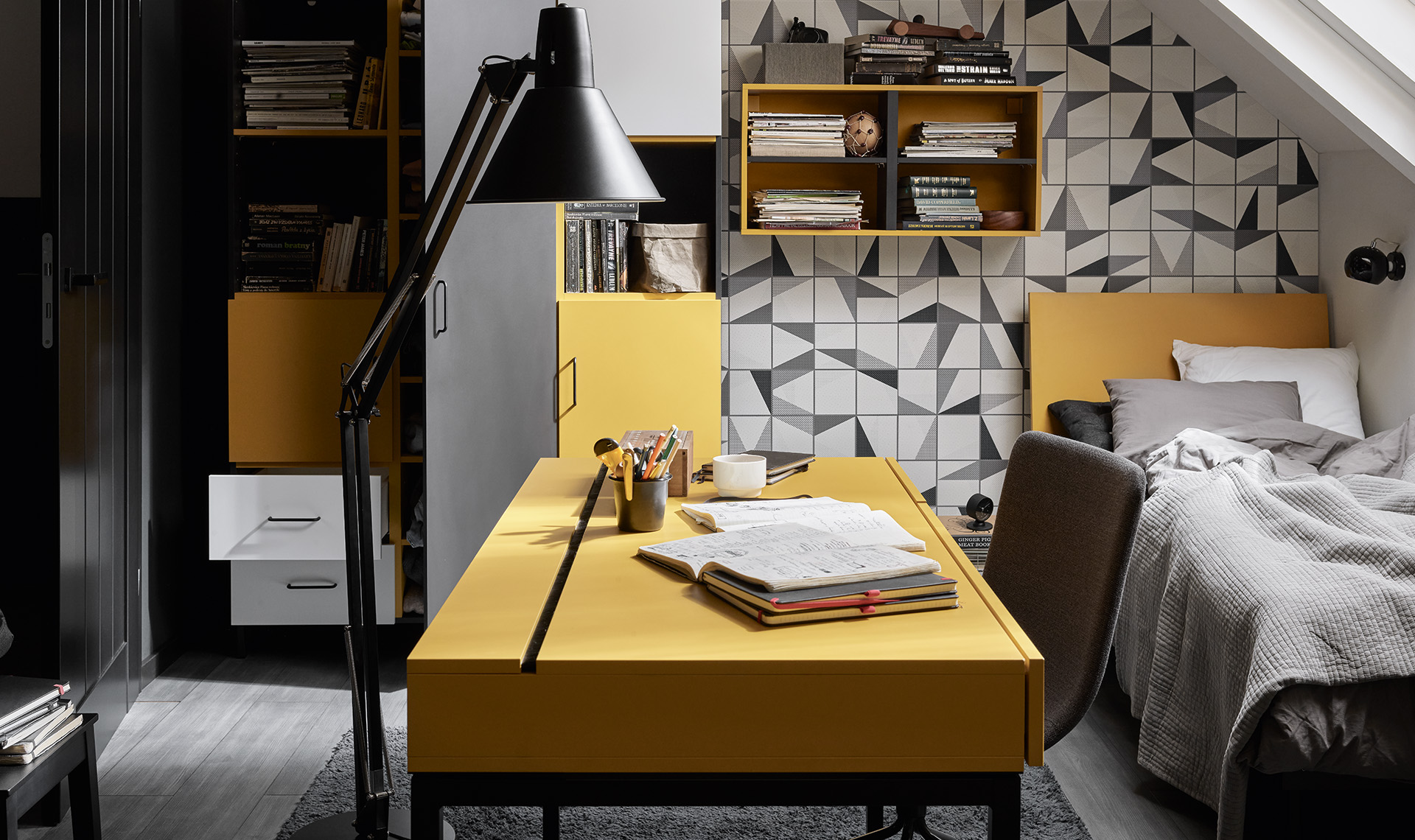 - Panele Origami Birds z kolekcji Geometric zdobi szaro-czarny nadruk. Elegancki graficzny motyw doskonale łączy się z różnymi meblami i dodatkami.