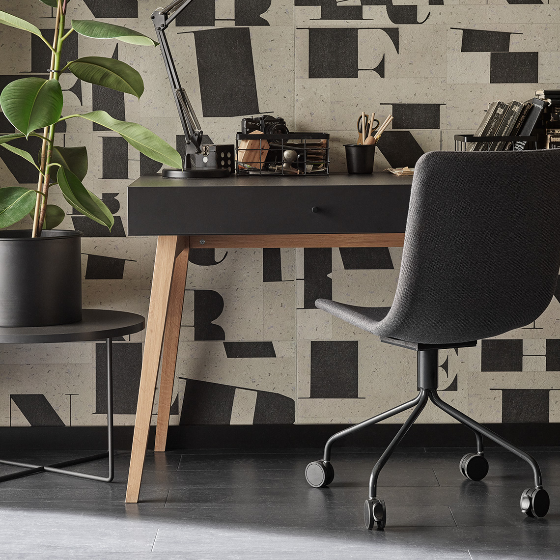 - Panele Typography mają beżowo-czarny kolor. Ponadczasowe wykończenie ściany szczególnie dobrze prezentuje się w połączeniu z drewnianym dekorem i metalowymi dodatkami.