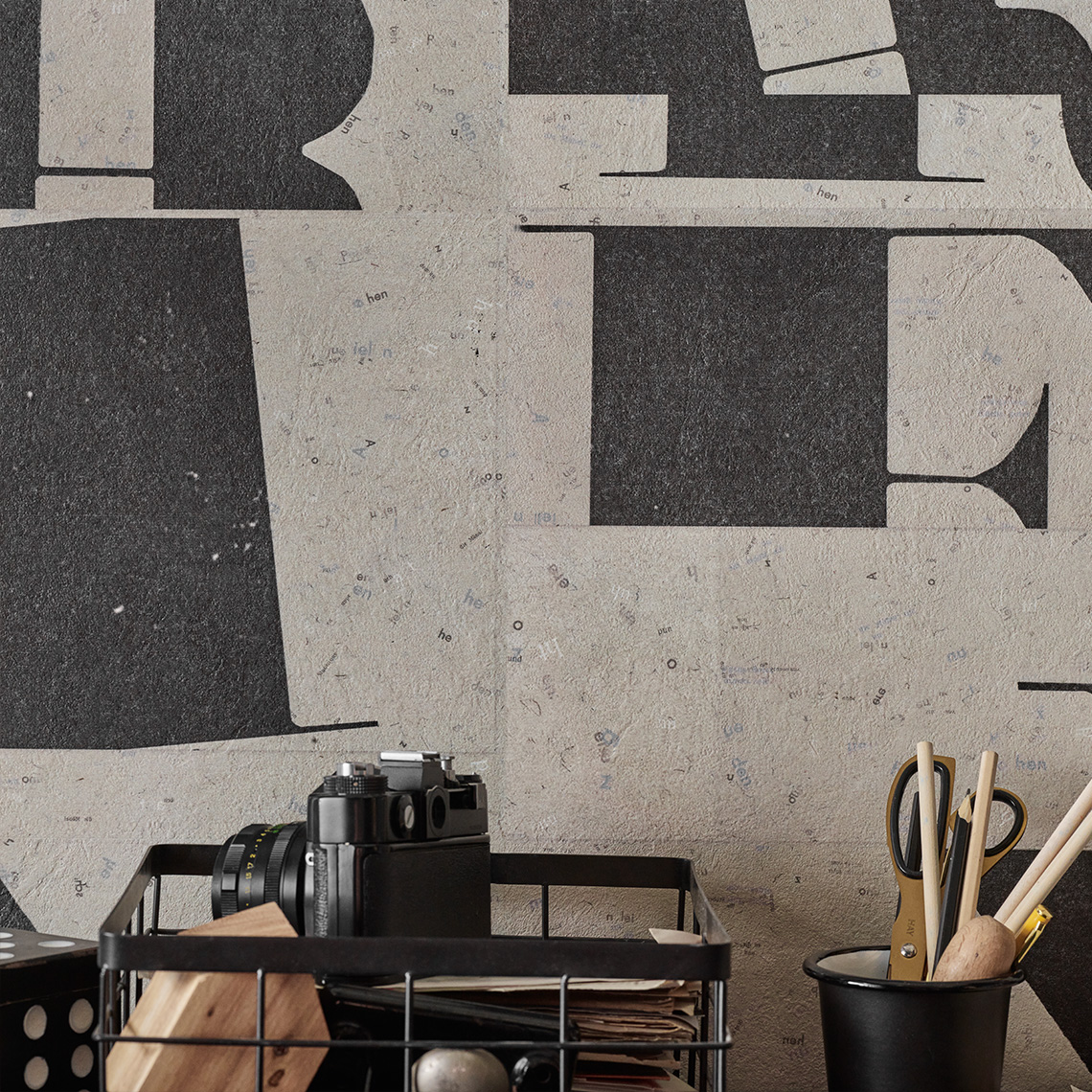 Panele Geometric Typography zdobi motyw liter nakreślonych atramentem na czerpanym papierze. Wytrzymałe wykończenie ściany w stonowanych odcieniach beżu i czerni stanowi inspirujące tło do pracowni, gabinetu lub biura. Charakter wzoru podkreśla wyczuwalna struktura.