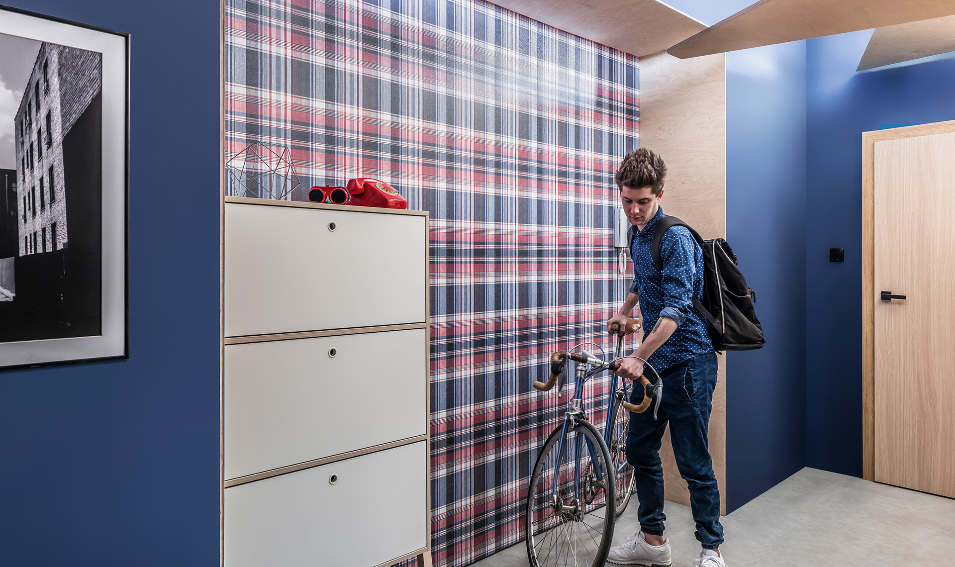 - Panele Scotch pokrywa szkocka krata w odcieniach czerwieni, granatu i bieli. Tekstylny deseń jest wyrazisty i ma dynamiczny charakter. Takie wykończenie ściany warto zestawić z gładkimi dodatkami, które uspokoją aranżację.