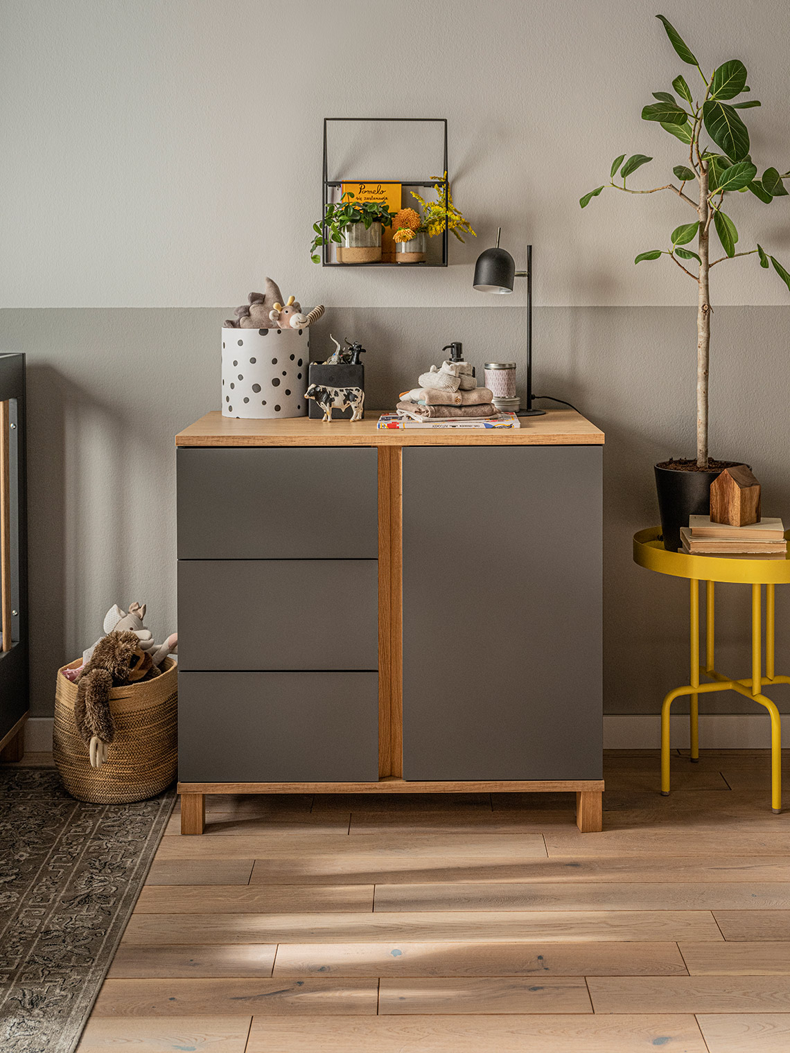 - Lewa część komody to 3 pojemne szuflady, a prawa – półka, na której można przechowywać pościel czy zabawki. Zastosowany system cichego domyku zapewnia codzienny komfort korzystania z mebla.