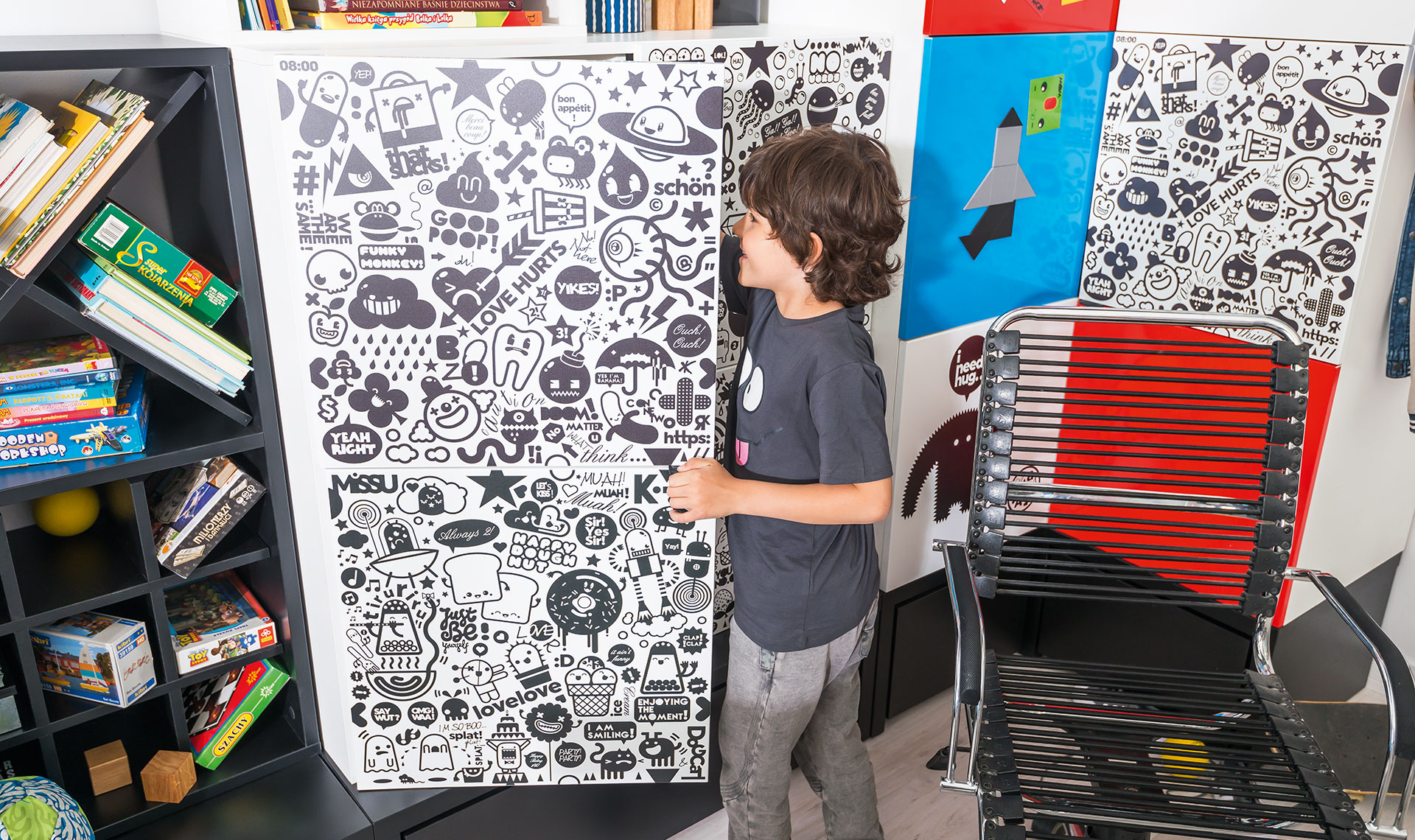 - Aby odmienić wygląd mebla, wystarczy dokupić specjalne metalowe nakładki na fronty. Mogą one pełnić nie tylko funkcję dekoracyjną, ale także edukacyjną, kreatywną czy rozrywkową. Wykorzystaj magnesy, organizery i wiele innych praktycznych dodatków.