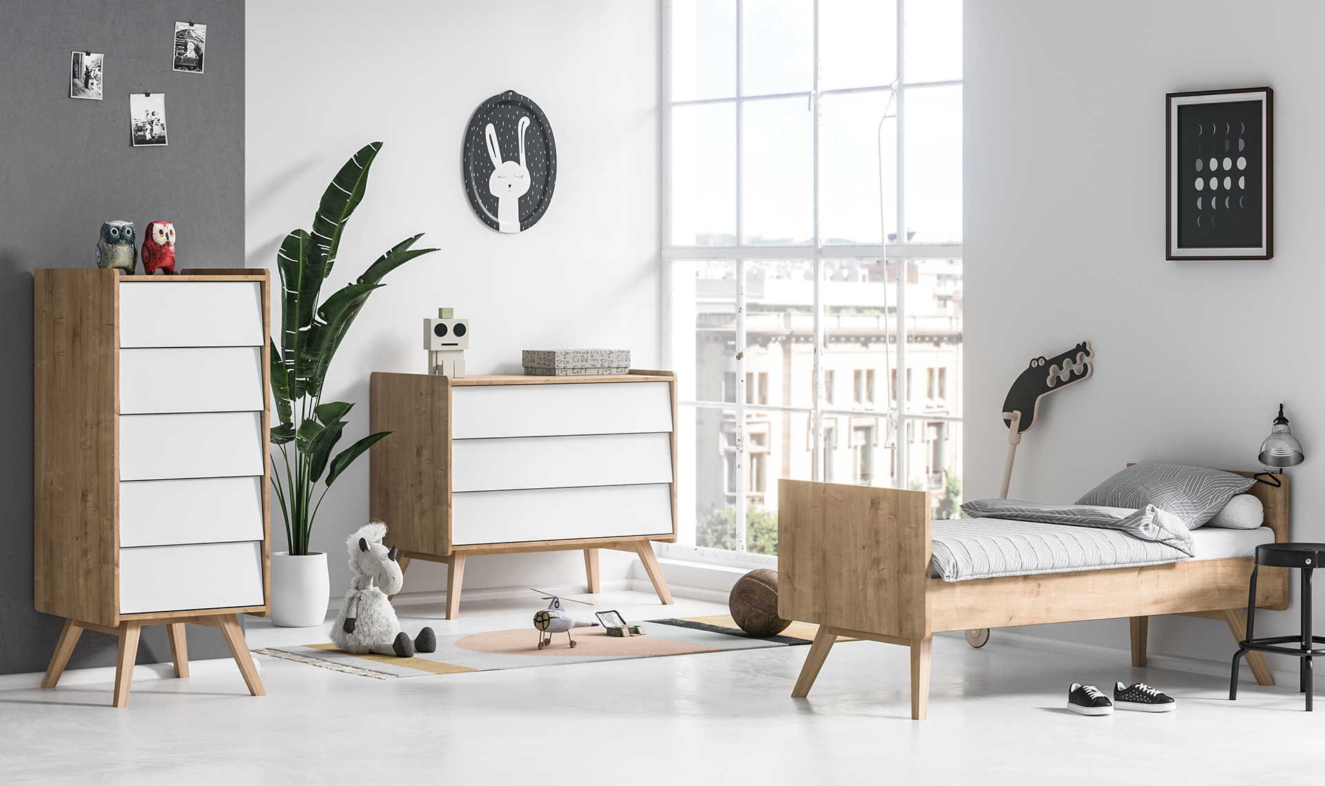 - Bezpieczeństwo korzystania z mebla zwiększają zaokrąglone narożniki. Wysokie ukośne nóżki nadają komodzie wizualnej lekkości i ułatwiają sprzątanie w pokoju.