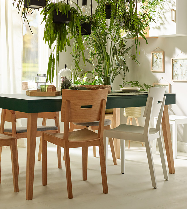 - W wersji dębowej: oparcie i siedzisko krzesła posiadają strukturę, będącą odwzorowaniem naturalnego rysunku drewna. Powierzchnia krzeseł szarych, czarnych i białych wykończona jest gładkim matowym malowaniem.