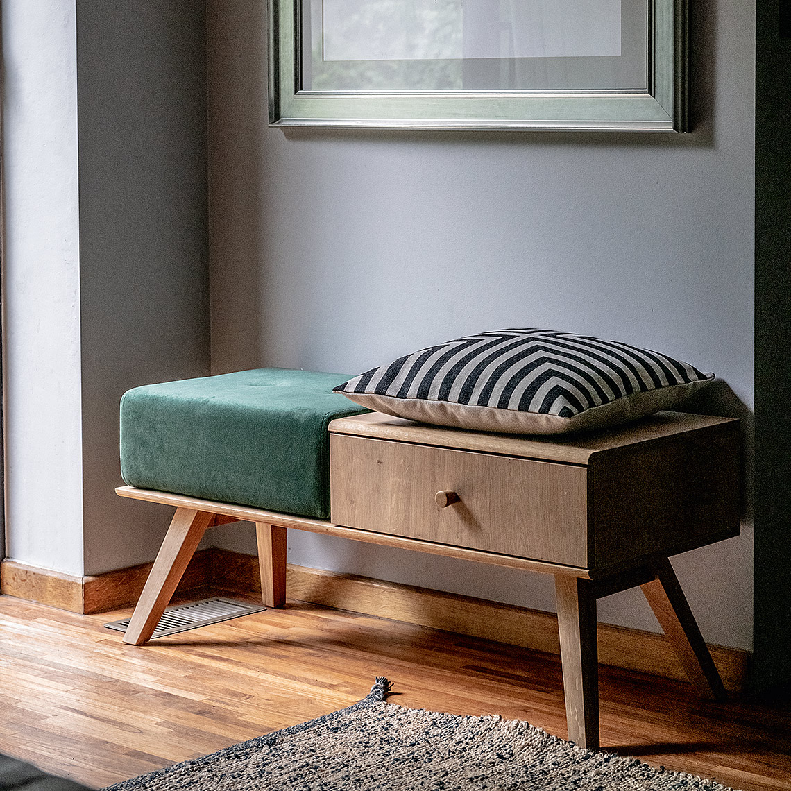 - Ławka z szufladą zajmuje niewiele miejsca, dzięki czemu sprawdzi się nawet w niewielkim korytarzu.