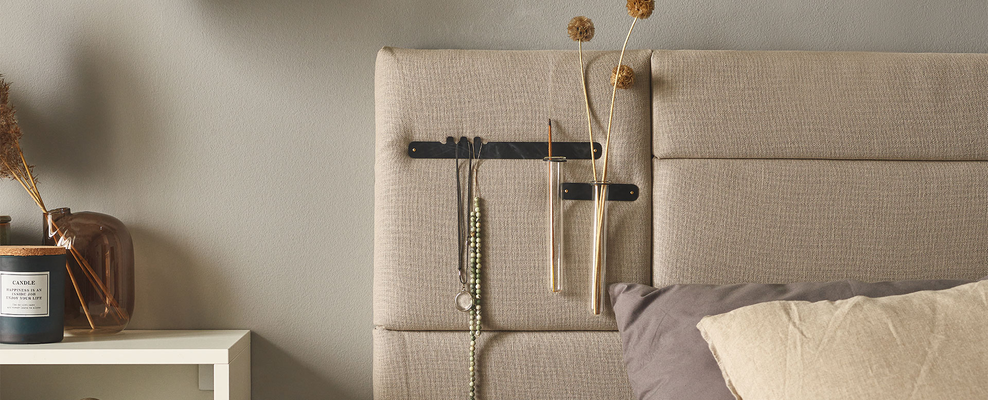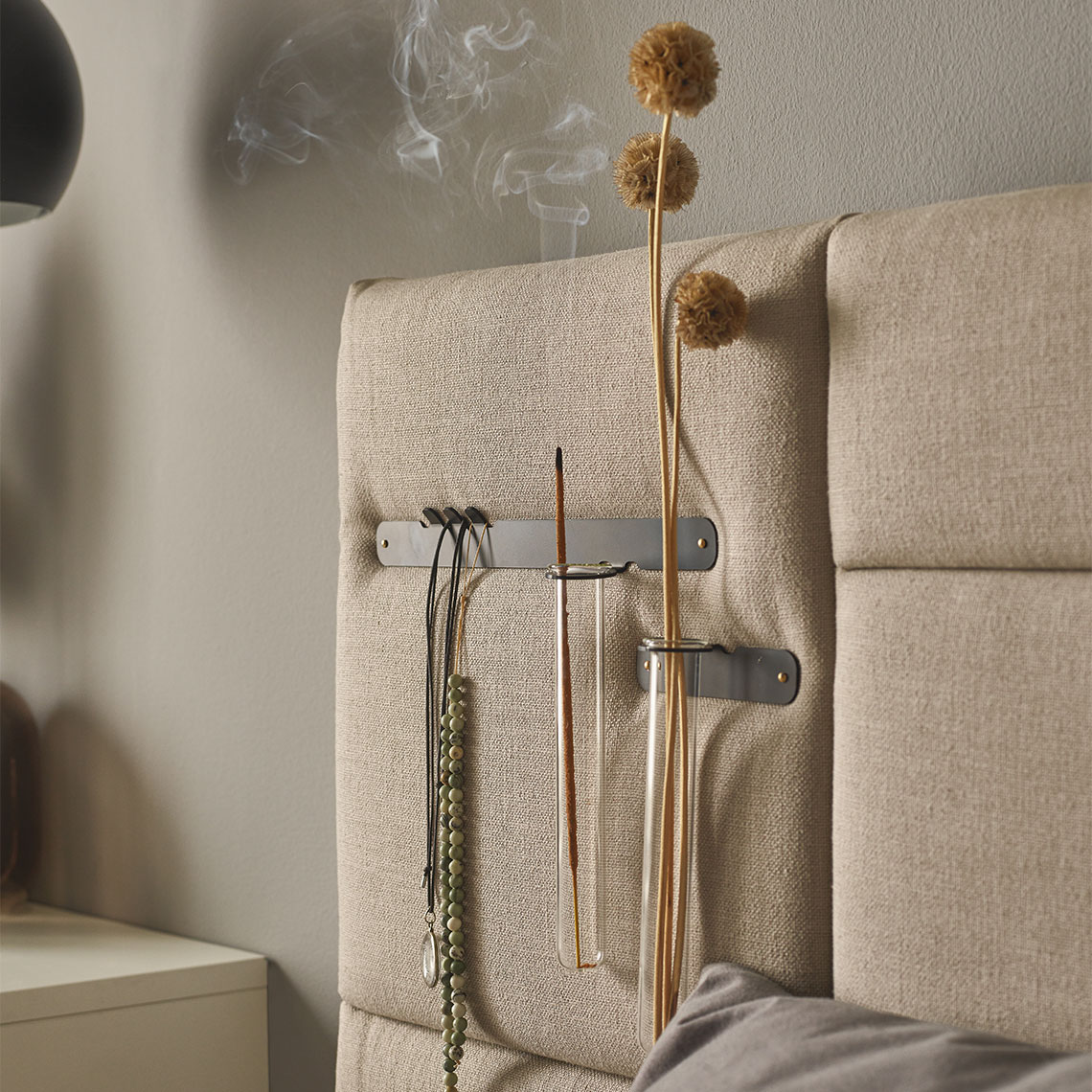 Kompozycja czarnych listew ze szklanymi fiolkami będzie ciekawym dopełnieniem wystroju wnętrza. Możesz zamontować je na meblach, panelach Soform albo ścianie i wyeksponować z ich pomocą drobiazgi, które zadbają o nastrój. Ulubiona biżuteria, suszona lawenda, stale gubiące się słuchawki – zestaw zaprojektowany przez Dorotę Balewicz zapewni Ci codzienną wygodę i prawdziwą swobodę aranżacji.