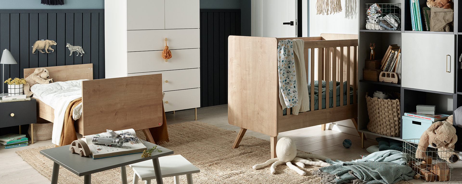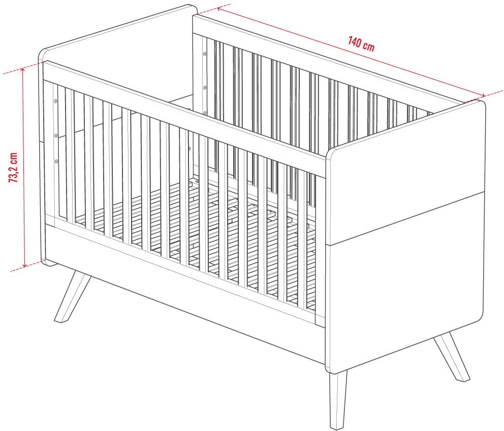- Zgrabne łóżeczko w stylu retro posiada ukośne dębowe nóżki i drewniany stelaż. Zapewnia on odpowiednią wentylację i cyrkulację powietrza, ograniczając alergeny.
