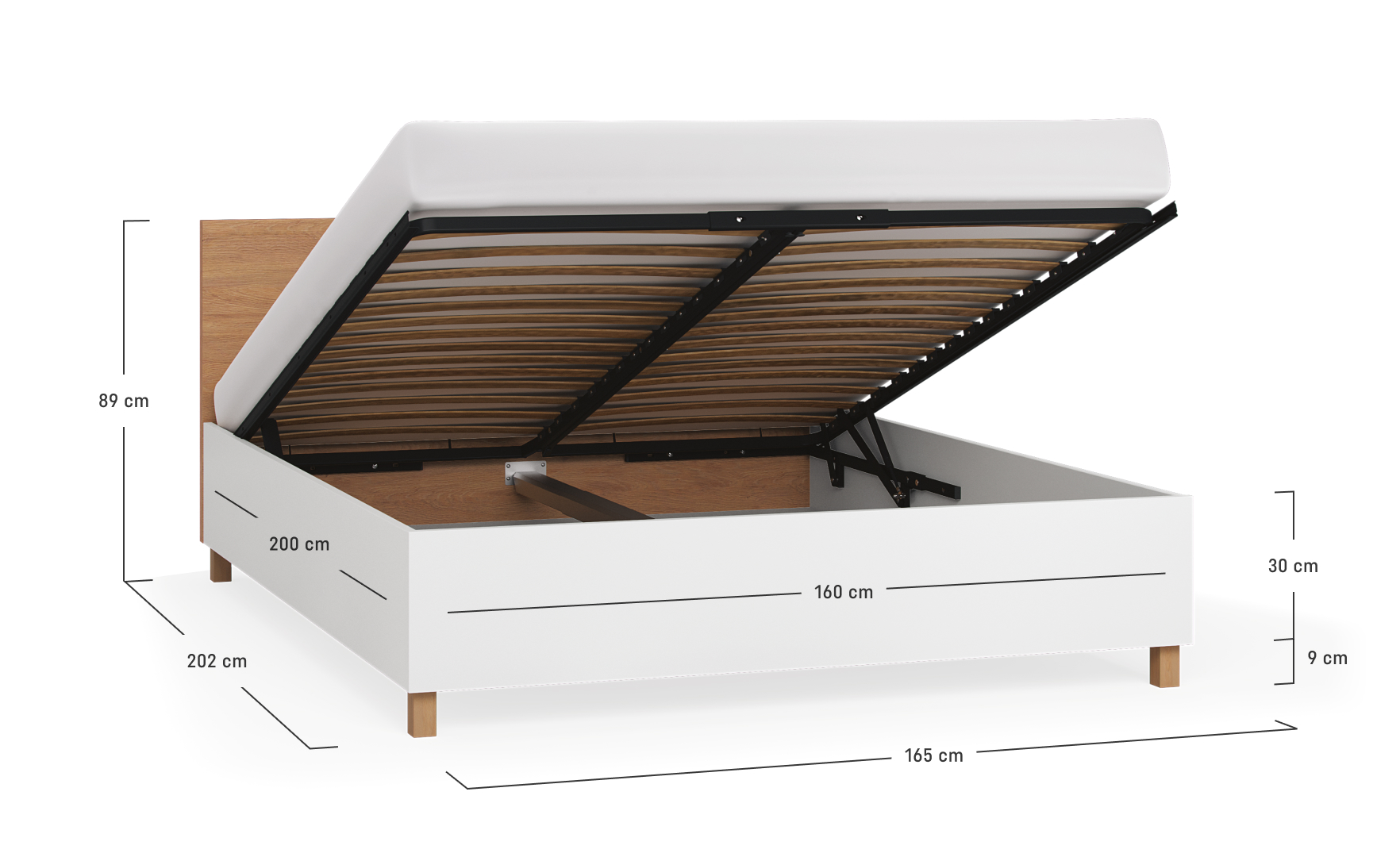 - Rzeczywista głębokość łóżka z przykręconym wezgłowiem wynosi 204,5 cm; wysokość oskrzyń łóżka na ślizgaczach, to 30,5 cm.