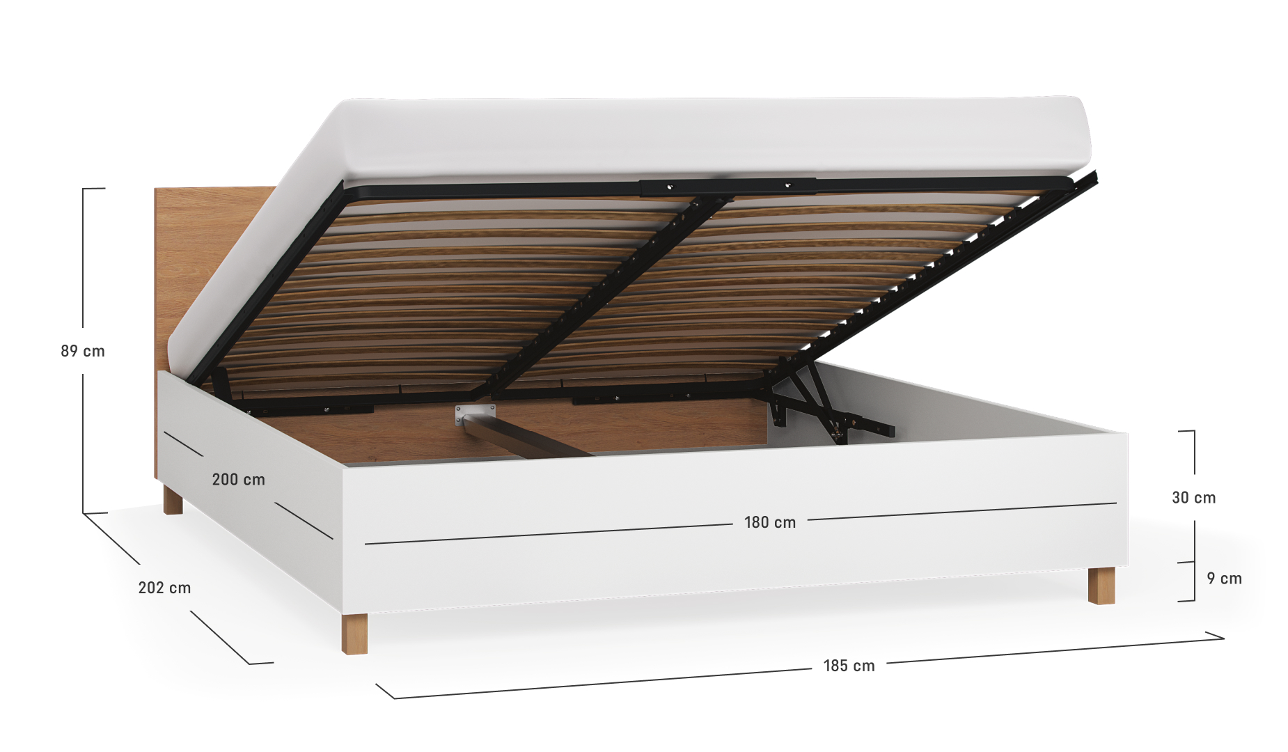 - Rzeczywista głębokość łóżka z przykręconym wezgłowiem wynosi 204,5 cm; wysokość oskrzyń łóżka na ślizgaczach, to 30,5 cm.