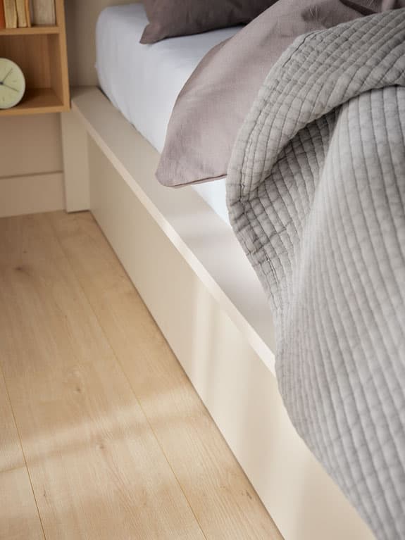- Łóżko jest dostępne w różnych wariantach. Może posiadać podłogę montowaną na stałe lub podnoszony stelaż, który zapewnia dodatkową przestrzeń do przechowywania pod materacem o powierzchni 200 x 140,2 x 20 cm.