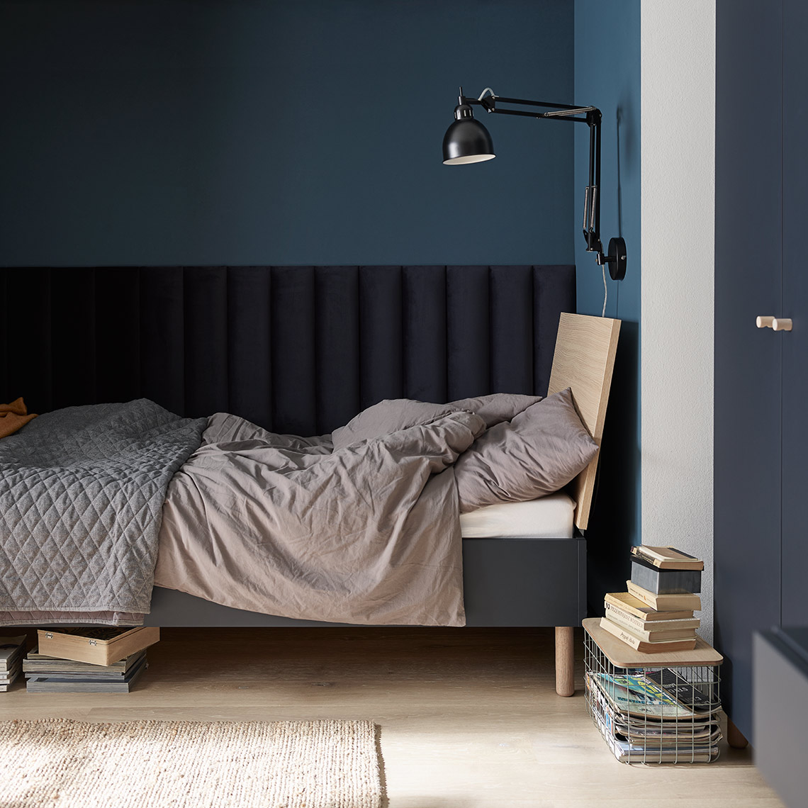 - Dla oskrzyni i wezgłowia możesz wybrać jeden z 11 kolorów (biały, czarny, szary, zielony, indygo, nude, szafran, deseń dębowy w czterech odcieniach). Każda część wykończona jest oddzielnie.