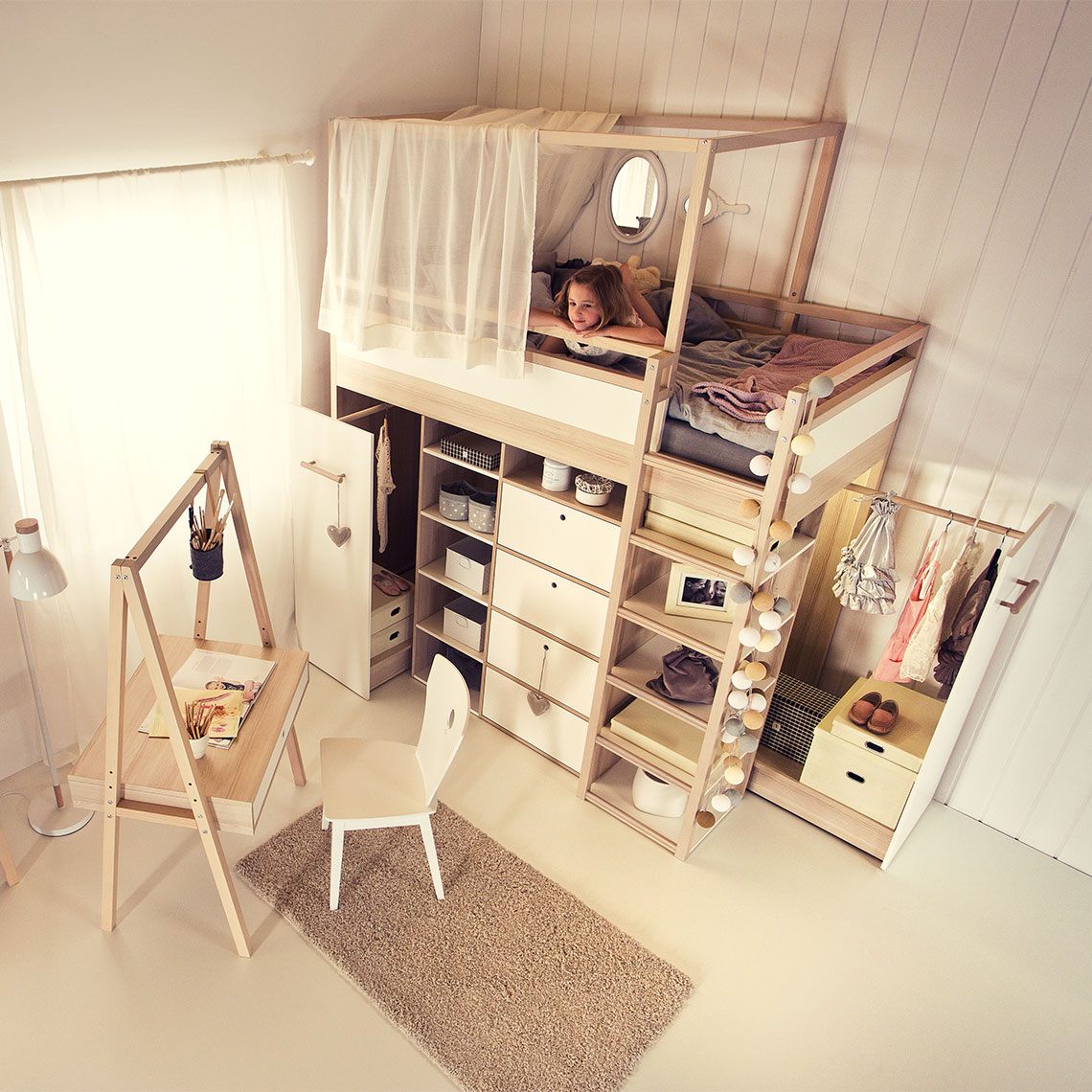 - Przestrzeń do spania można uatrakcyjnić, dokupując drewniany baldachim. Można zawiesić na nim łańcuch lampek, przyborniki z drobiazgami lub lekką tkaninę i oddzielić łóżko od reszty pokoju.