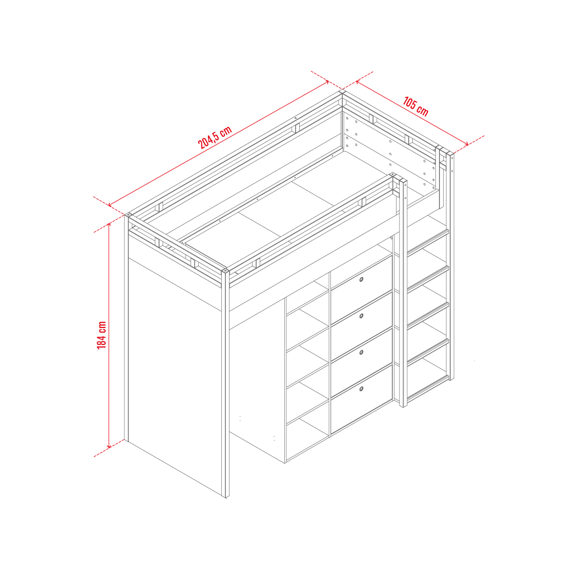 - Powierzchnia spania łóżka wynosi 90 x 200 cm. Wygodny dostęp na piętro zapewnia solidna drabinka, przyjazna dla dzieci. Dzięki burcie przebywanie na górze jest w pełni bezpieczne, a sen – komfortowy.