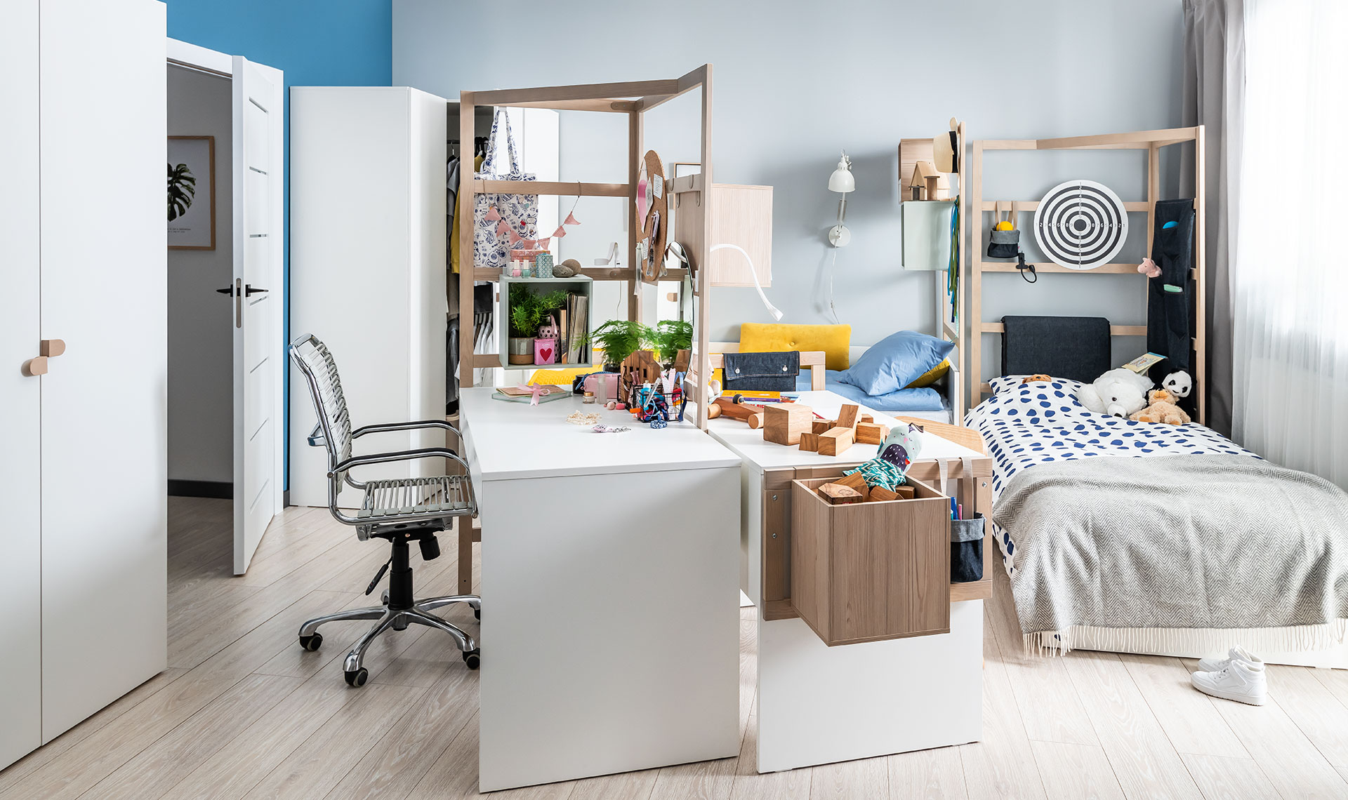 - Łóżko można połączyć z jedną lub dwiema drabinkami. To sprytna baza dla dedykowanych akcesoriów, takich jak kolorowe skrzynki czy poręczne organizery. Do zaaranżowania szczebelków można wykorzystać także lampki i dekoracje.