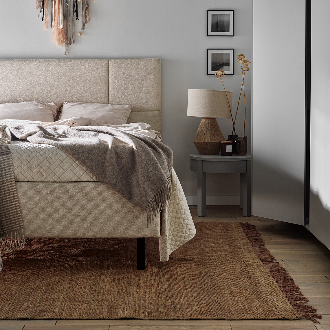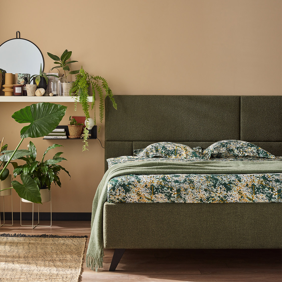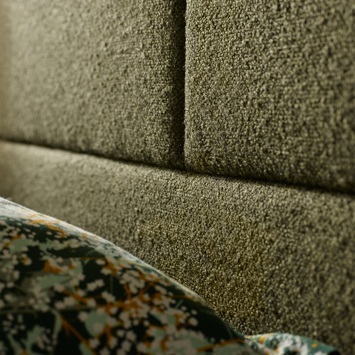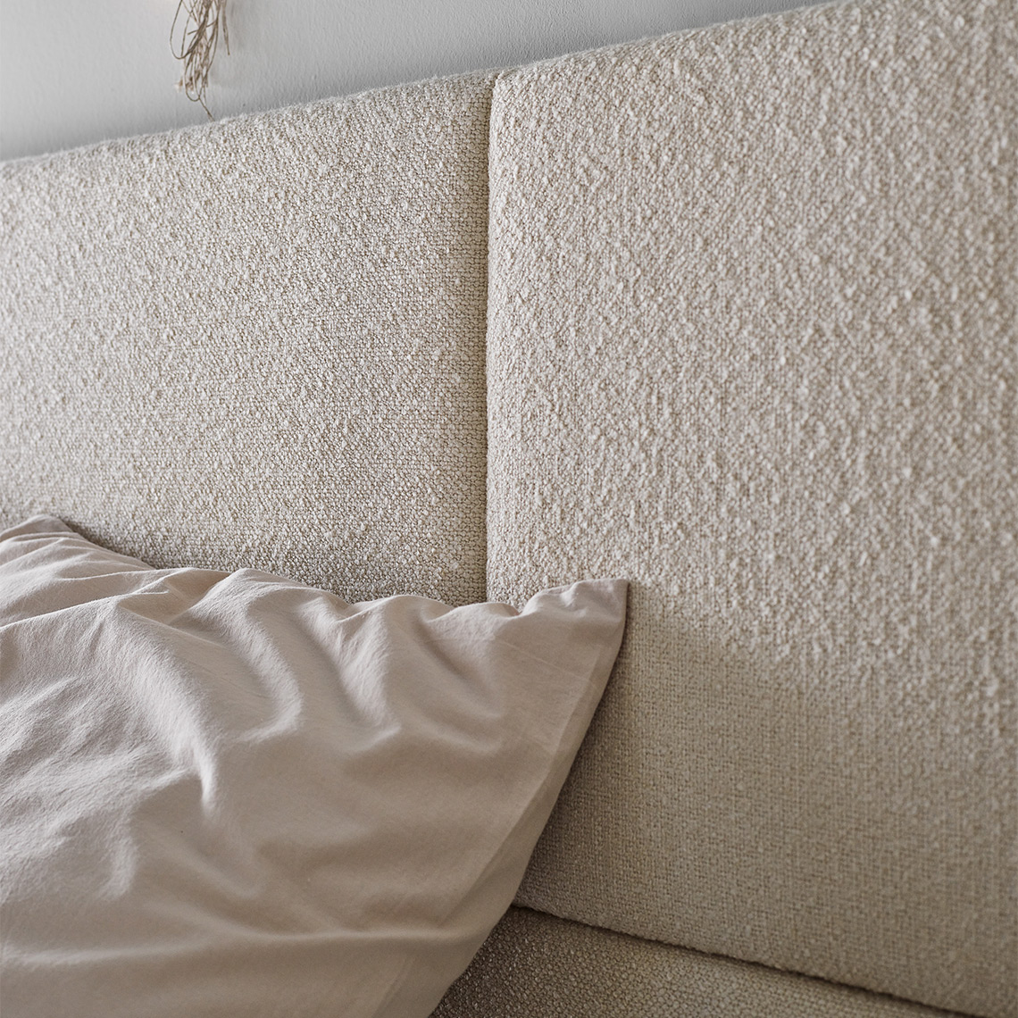 - Mebel jest pokryty tkaniną tapicerską – obito nią zarówno boki skrzyni, jak i zagłówek. Dzięki temu łóżko prezentuje się elegancko i nadaje sypialni przytulny charakter. Produkt można spersonalizować, wybierając rodzaj i kolor tapicerki – do wyboru są m.in. tkaniny naturalne, easy clean czy pet friendly. Wzornik znajduje się w salonie VOX.